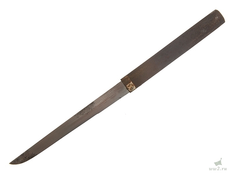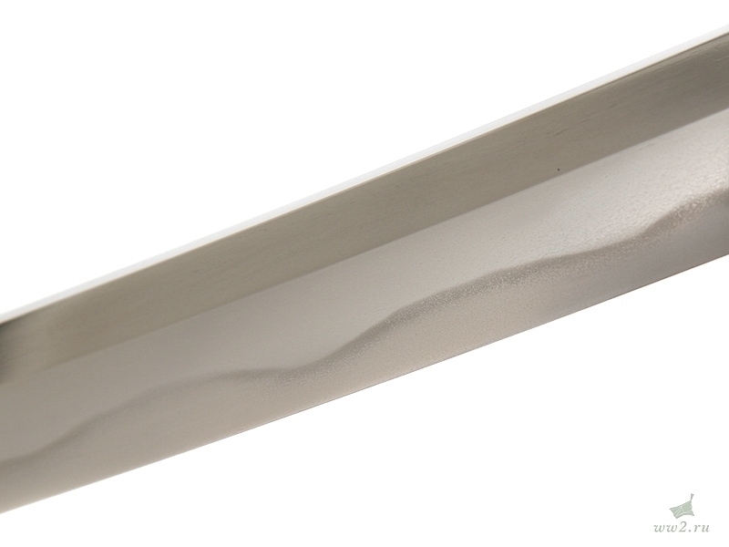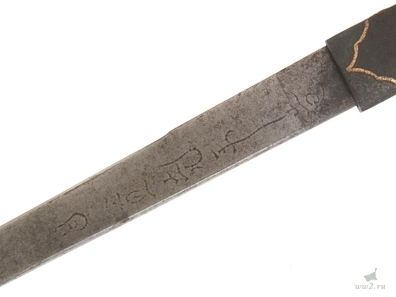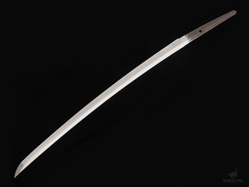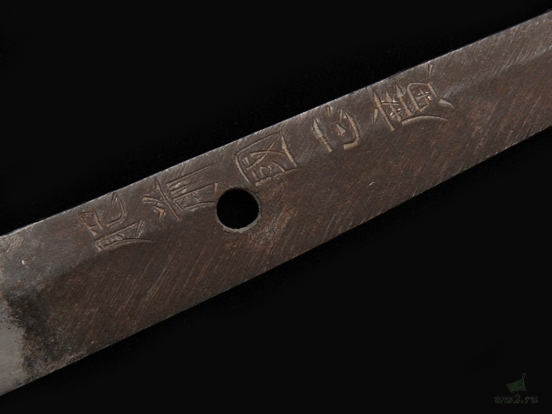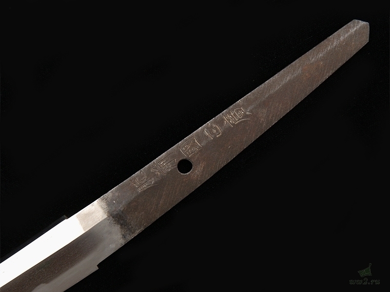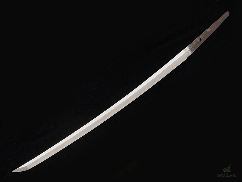 Клинок незначительной кривизны, с четко выраженной линией закалки (хамон). Хвостовик с подписью мастера имеет одно отверстие для монтировки.