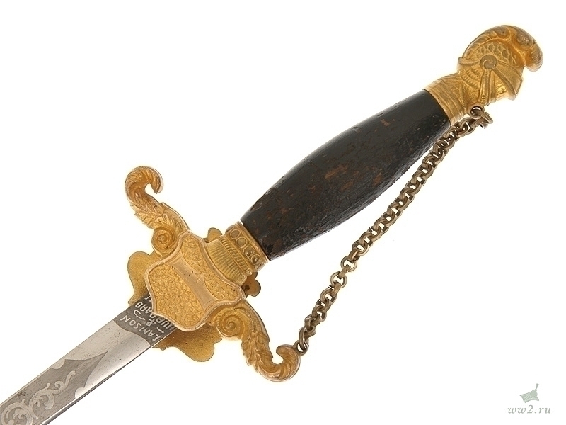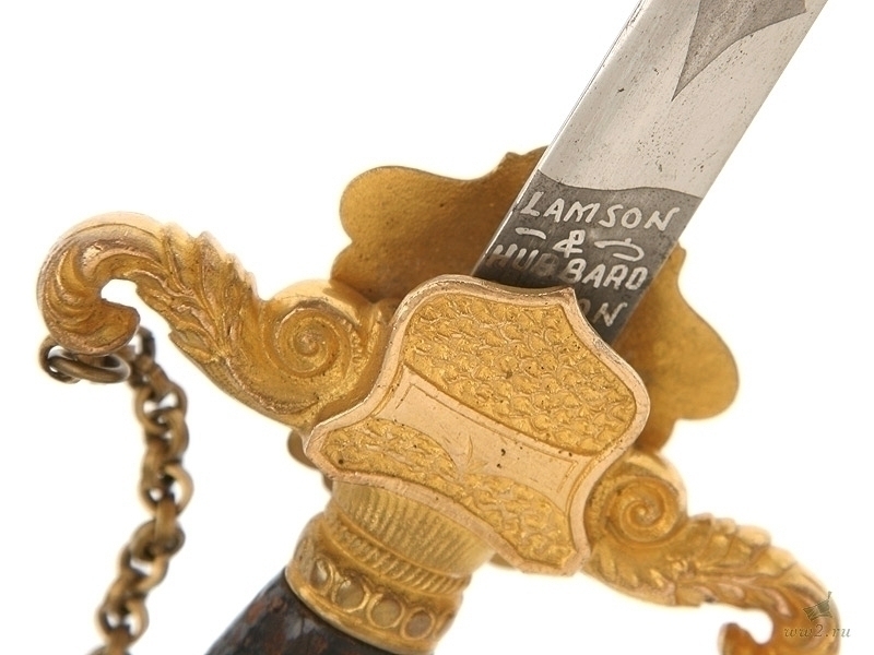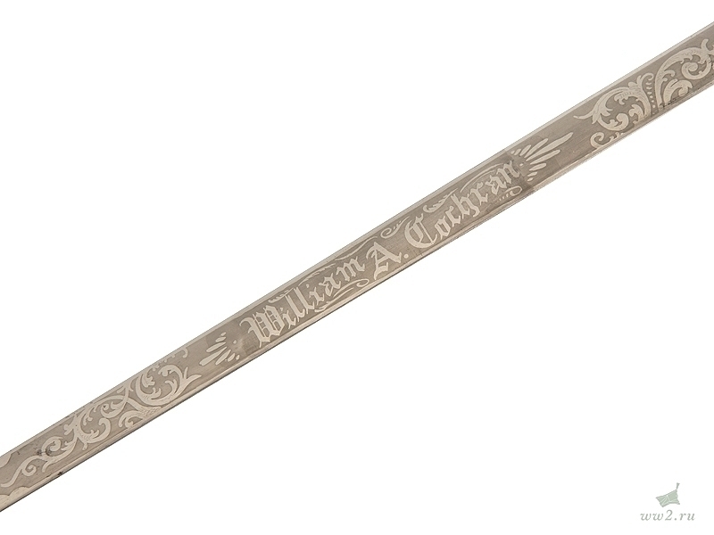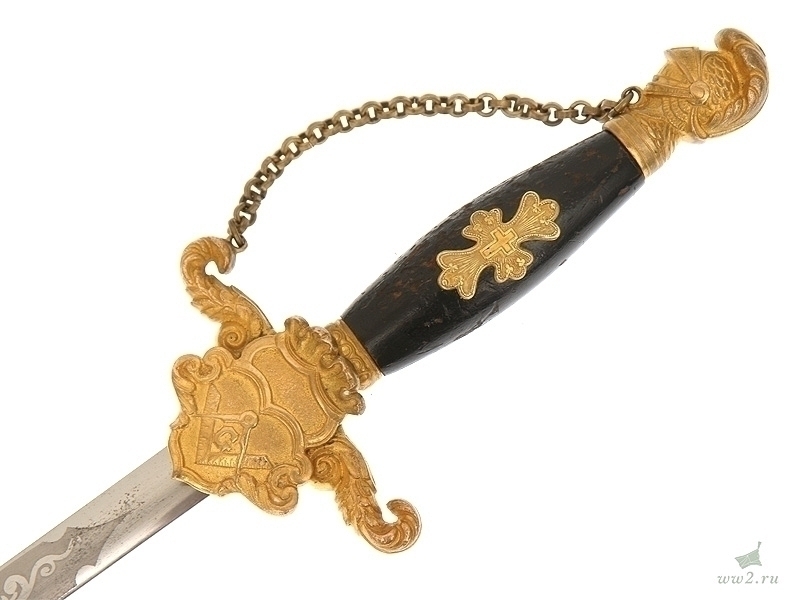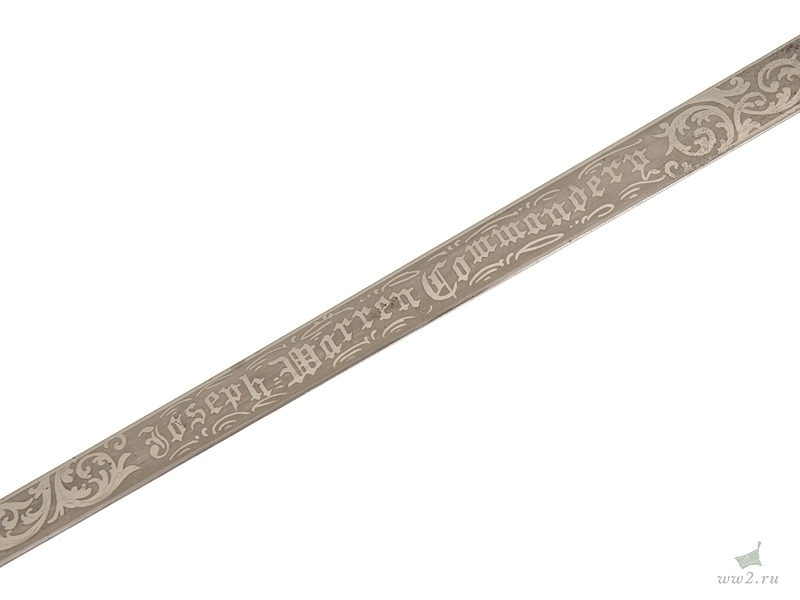 Ритуальная шпага масонского общества "Орден Красного Креста". Данный тип шпаги имели право носить все члены общества, находящиеся в звании "воинствующий рыцарь". Судя по масонским символам на контр-гарде (большие циркуль и линейка), данный экземпляр принадлежал члену общества, состоявшему в должности "мастер-масон". Клинок никелированный, украшен травлением: изображена различная масонская символика. На обратной имеется клеймо "Joseph Marren Commandery" - вероятно, локального подразделения данного общества. На лицевой стороне клинка нанесены имя и фамилия владельца - "William A.Gorhram". У основания клинка помещено клеймо изготовителя "Lamson & Hubbard". Навершие трактовано в виде рыцарского шлема. Металлический прибор рукояти латунный позолоченный. Изготовлена в США в конце 19 - начале 20 века. В комплект входит портупея.