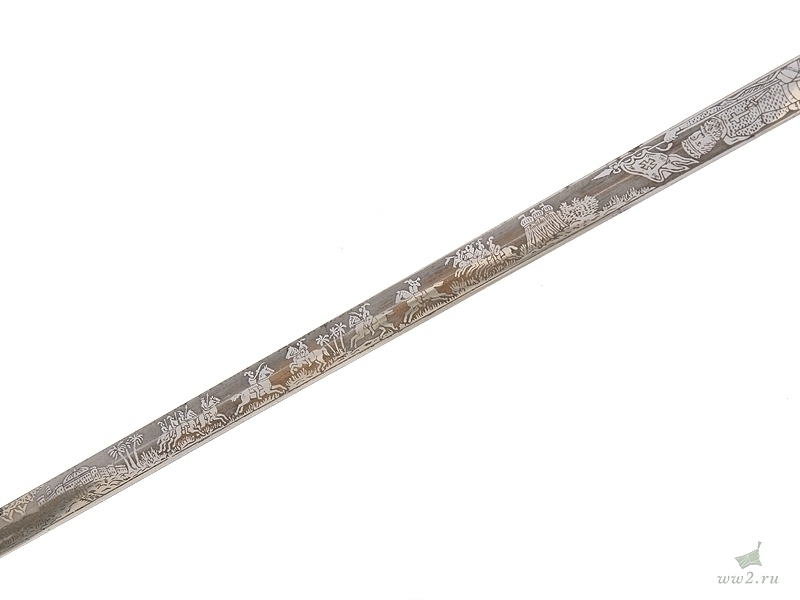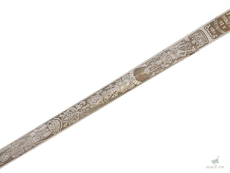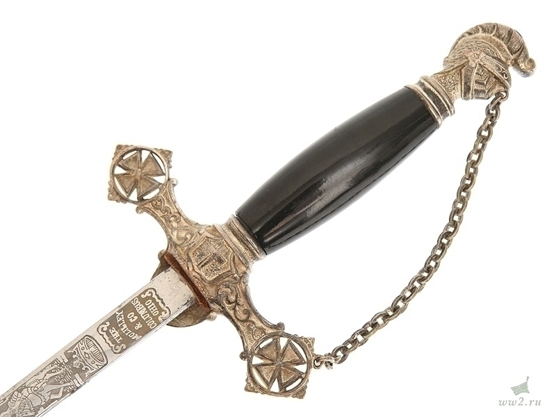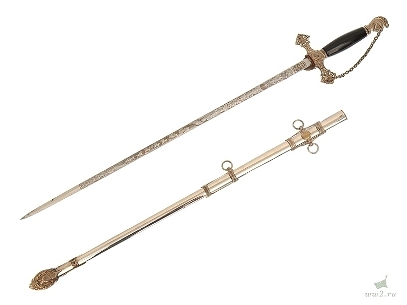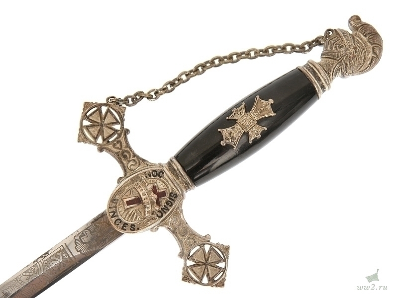 На рукояти расположена эмблема общества - одна из разновидностей мальтийского креста. Данный тип шпаги имели право носить все члены общества, находящиеся в звании "воинствующий рыцарь" и имеющие статус "высокопоставленный командующий". Клинок никелированный, богато украшен травлением: изображены всадники из легенды о храме Соломона и различная масонская символика. На лицевой стороне клинка нанесены имя и фамилия владельца - "Thomas Johns". Клинок маркирован клеймом изготовителя "The Mс Lilley & Co Columbus Ohio". Навершие трактовано в виде рыцарского шлема. Металлический прибор рукояти латунный посеребренный. Ножны металлические, с гайкой и наконечником, на них также имеется различная масонская символика, в частности, разновидности мальтийского и латинского крестов . Изготовлена в США в конце 19 века - начале 20 века.