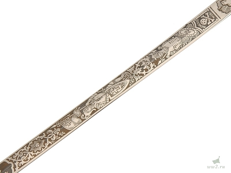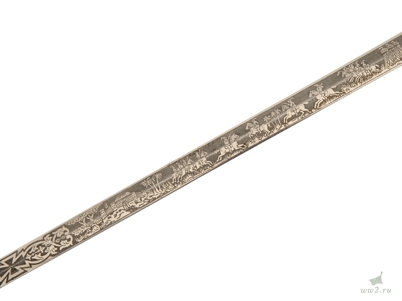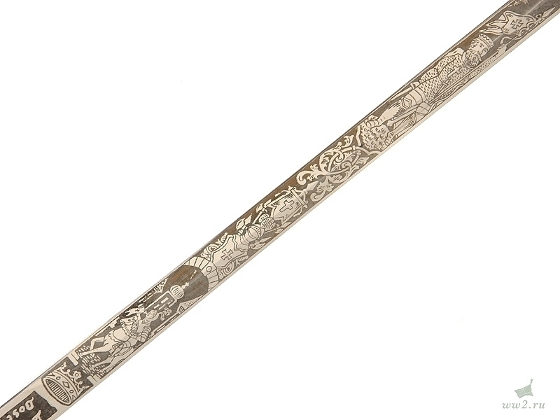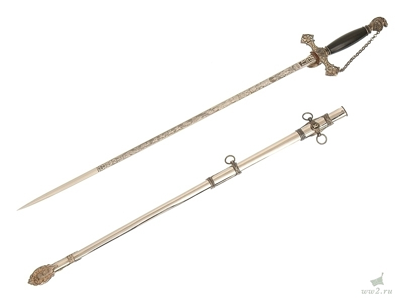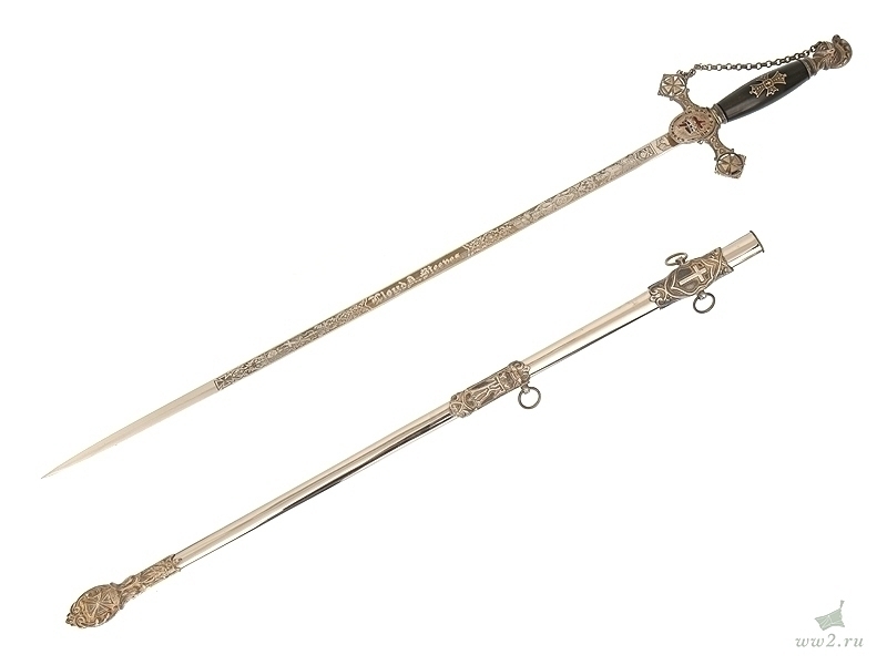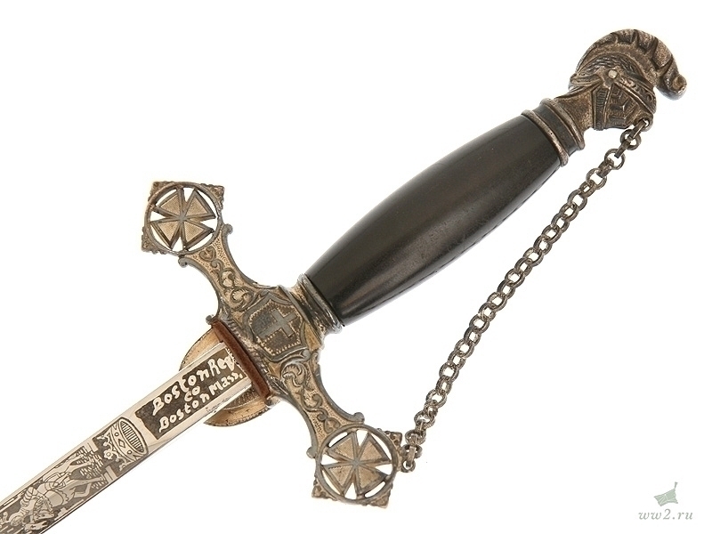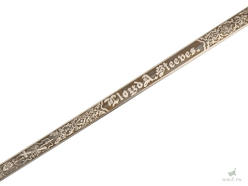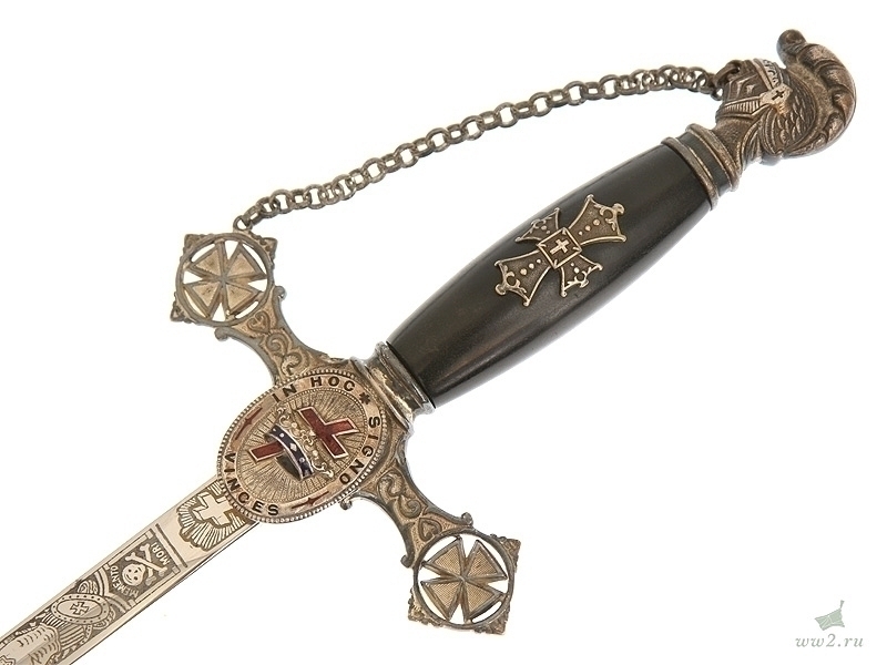 На рукояти расположена эмблема общества - одна из разновидностей мальтийского креста. Данный тип шпаги имели право носить все члены общества, находящиеся в звании "воинствующий рыцарь" и имеющие статус "высокопоставленный командующий". Клинок никелированный, богато украшен травлением: изображены всадники из легенды о храме Соломона, рыцари и различная масонская символика. На лицевой стороне клинка нанесены имя и фамилия владельца - "Floyd A. Steedes". Клинок маркирован клеймом изготовителя "Boston Reg Co, Boston Mass". Навершие трактовано в виде рыцарского шлема. Металлический прибор рукояти латунный посеребренный. На гарде имеется надпись - "In hoc signo vinces". Ножны металлические, с гайкой и наконечником, на них также имеется различная масонская символика, в частности, разновидности мальтийского и латинского крестов. Изготовлена в США в конце 19 века - начале 20 века.