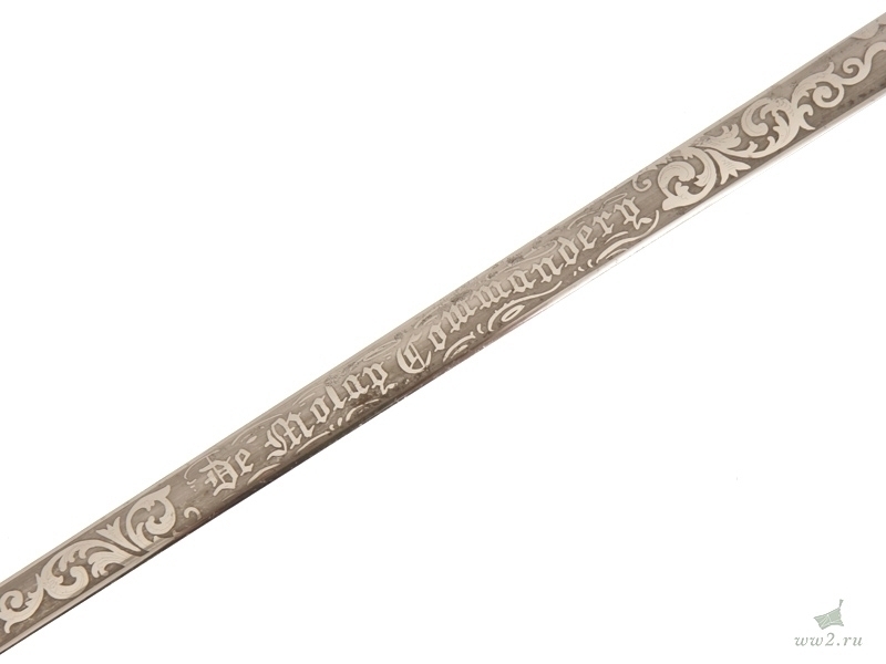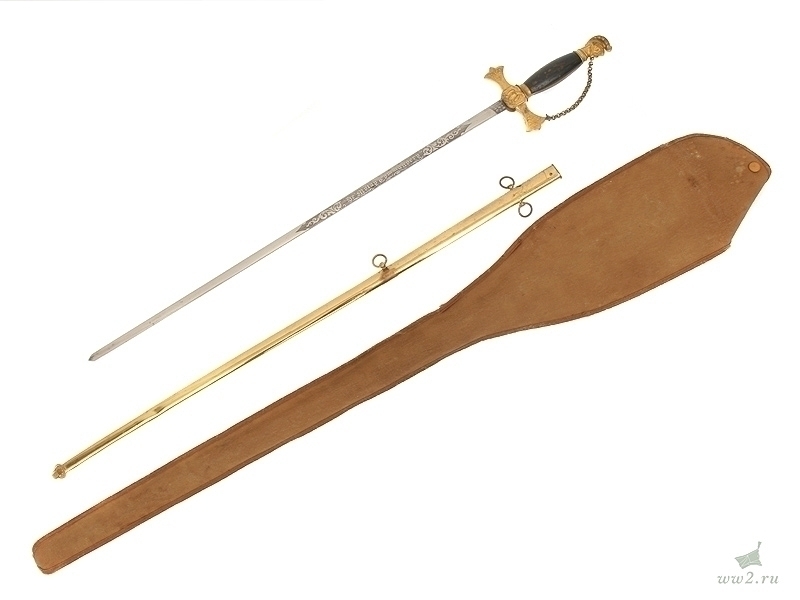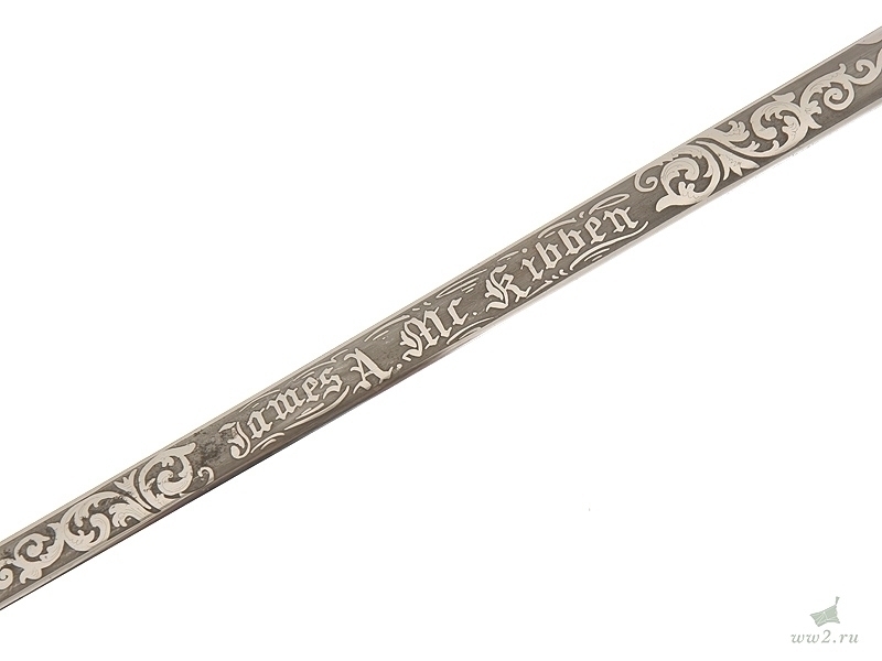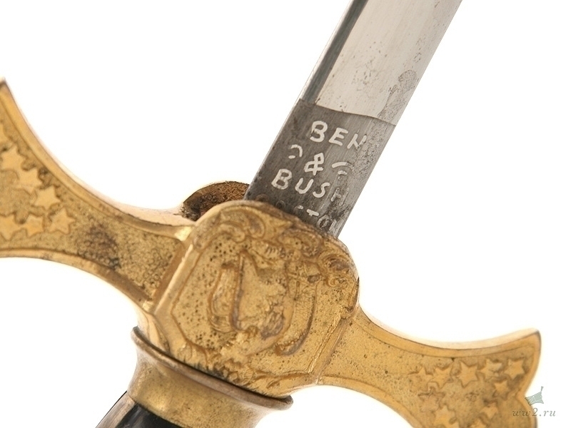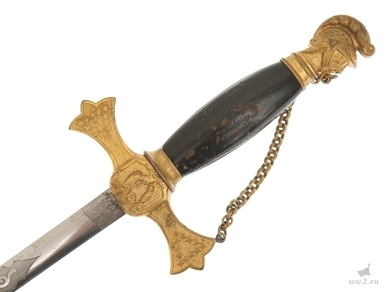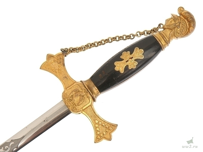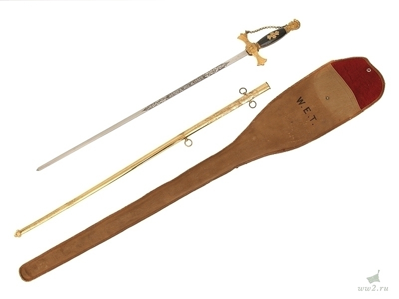 Ритуальная шпага масонского общества "Орден рыцарей Мальты". На рукояти расположена эмблема общества - одна из разновидностей мальтийского креста. "Первичной ячейкой" общества являлся "монастырь" и судя по всему, данный тип шпаги имели право носить члены общества, находящиеся в ранге "настоятель монастыря". Клинок никелированный, украшен травлением: изображена различная масонская символика. На обратной имеется клеймо "The Molay Commandery" - вероятно, локального подразделения данного общества. На лицевой стороне клинка нанесены имя и фамилия владельца - "James A. Mc. Ribben". У основания клинка помещено клеймо изготовителя "Ben & Bush Boston". Навершие трактовано в виде рыцарского шлема. Металлический прибор рукояти латунный позолоченный. Ножны металлические, с литыми фигурными устьем, гайкой и наконечником, маркированы клеймом "In Hoc Signa Vinces". Изготовлена в США в конце 19 - начале 20 века. В комплект входит чехол, маркированный клеймом "W.E.T".