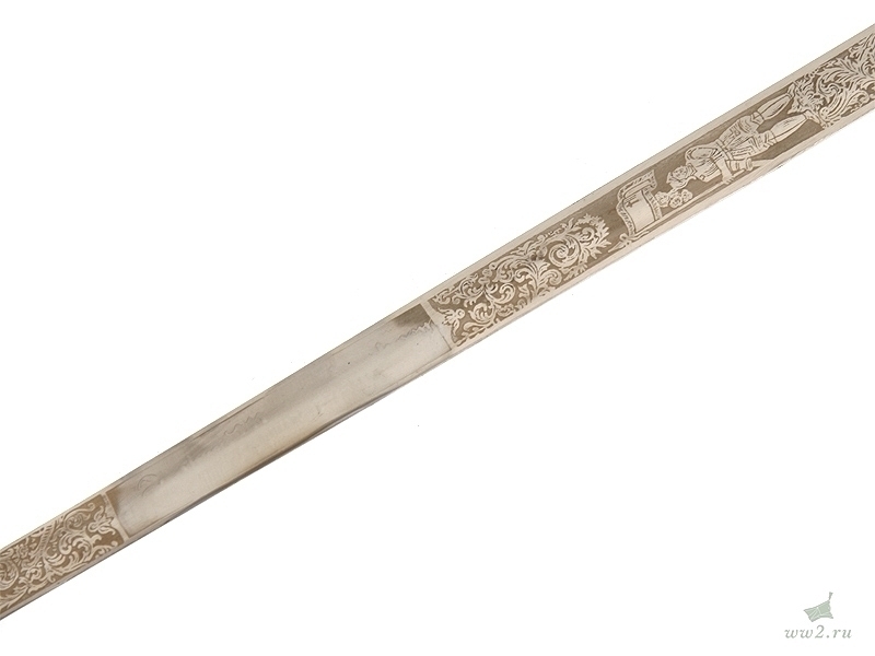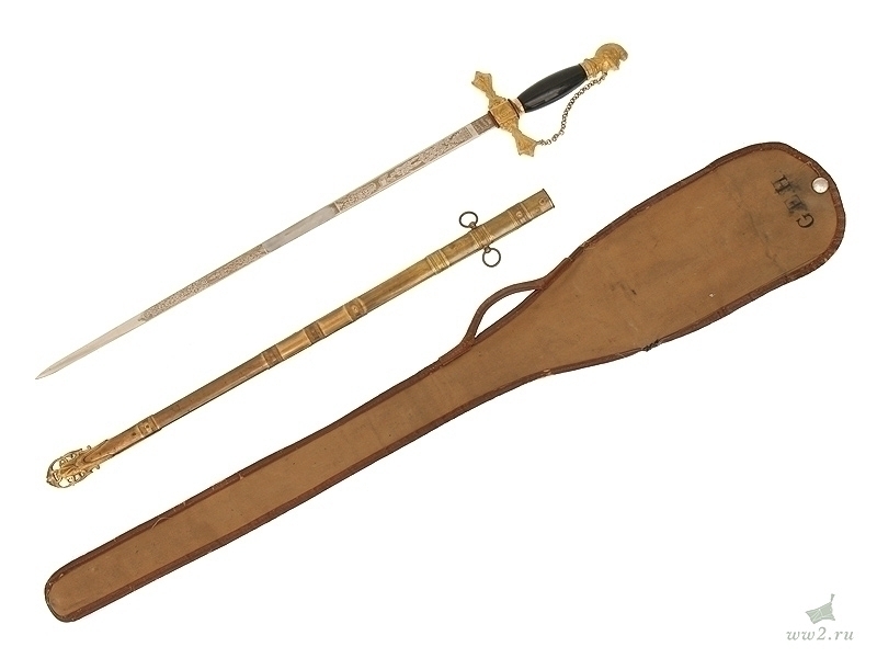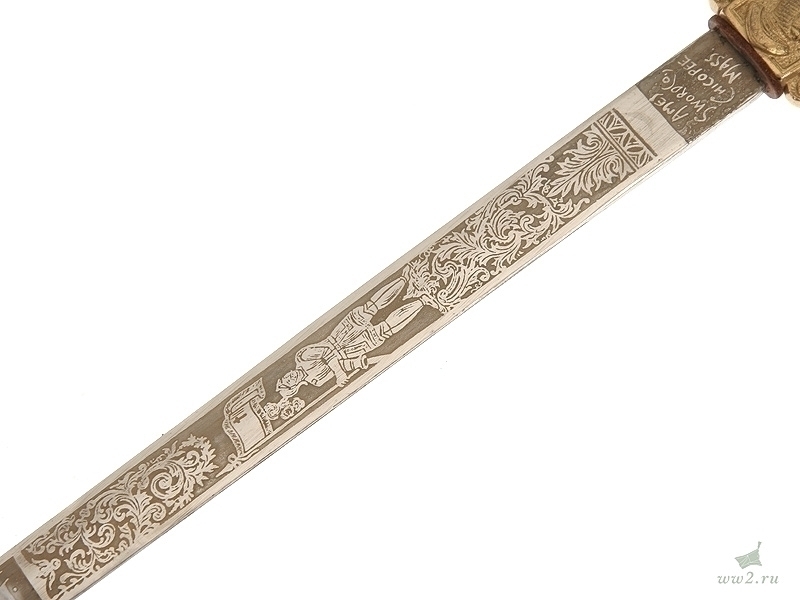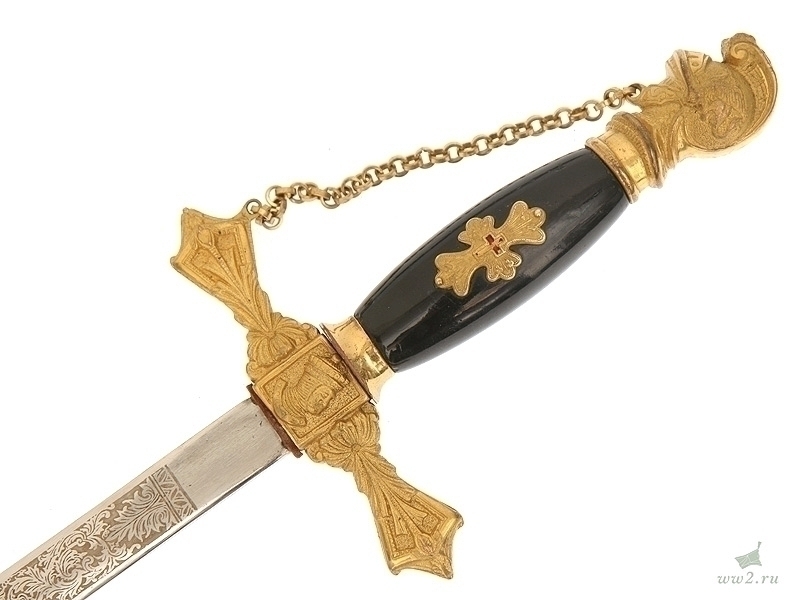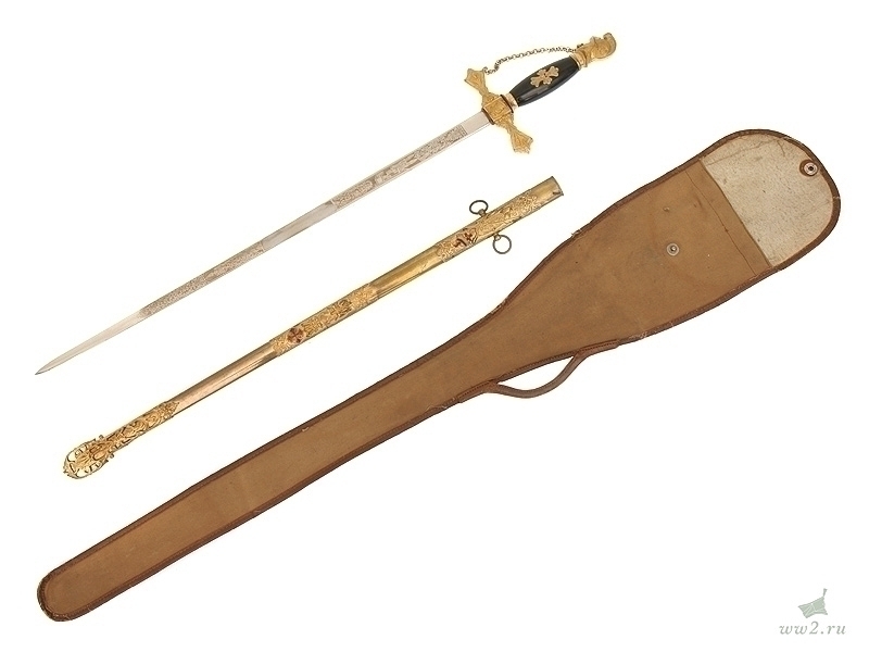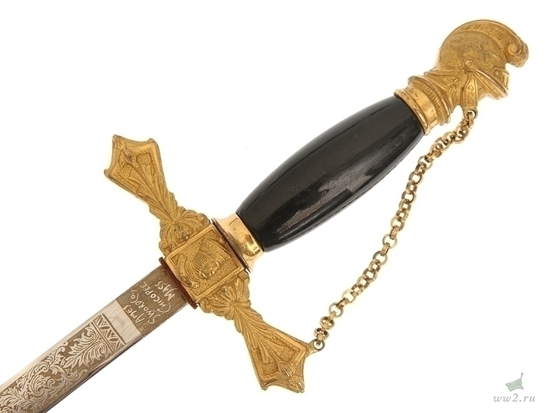 Ритуальная шпага масонского общества "Орден рыцарей Мальты". На рукояти расположена эмблема общества - разновидность мальтийского креста. Данный тип шпаги имели право носить члены общества, находящиеся в ранге "воинствующий рыцарь". Клинок никелированный, украшен травлением: изображена различная масонская символика. Основание клинка маркировано "Ames Sword Co Chicopee Mass". Что любопытно: на лицевой стороне клинка практически невозможно прочитать имя и фамилию владельца а на обратной - данные подразделения общества, к которому при жизни принадлежал хозяин шпаги.