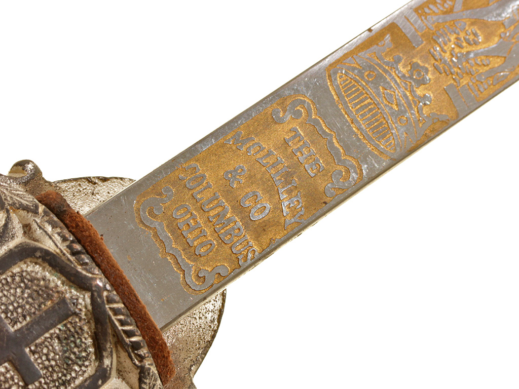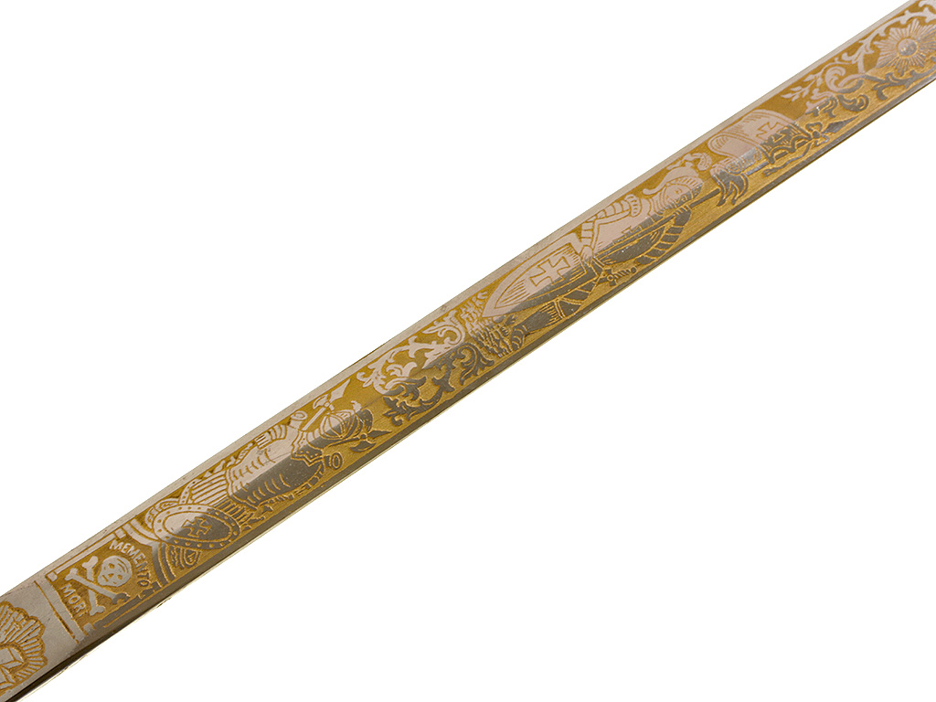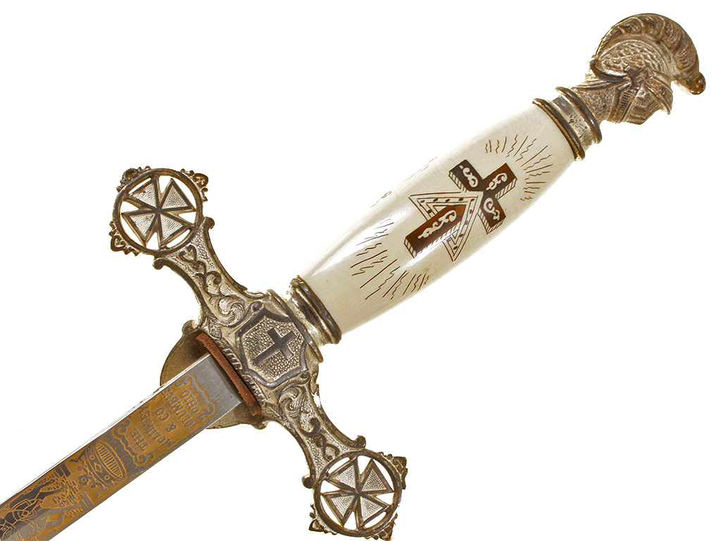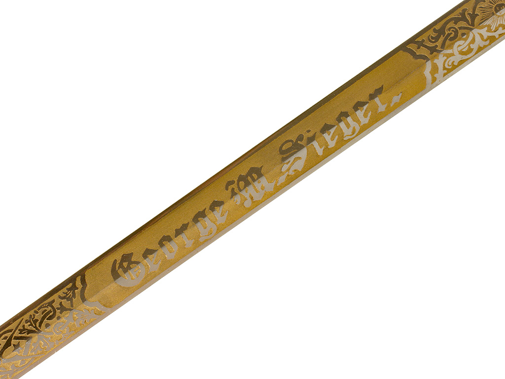 Клинок никелированный, украшен травлением и золочением: на лицевой стороне нанесена фамилия владельца (George M. Sieger), с оборотной - сценка с изображением конных рыцарей в Палестине. Навершие трактовано в виде рыцарского шлема. Очень хорошее состояние.