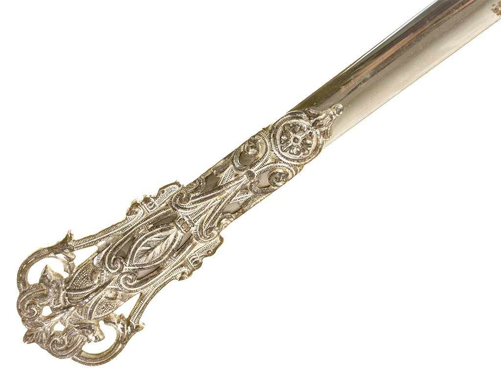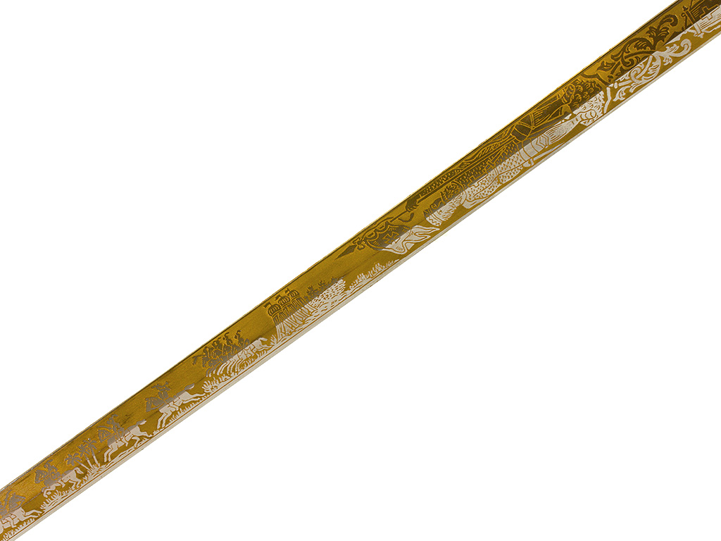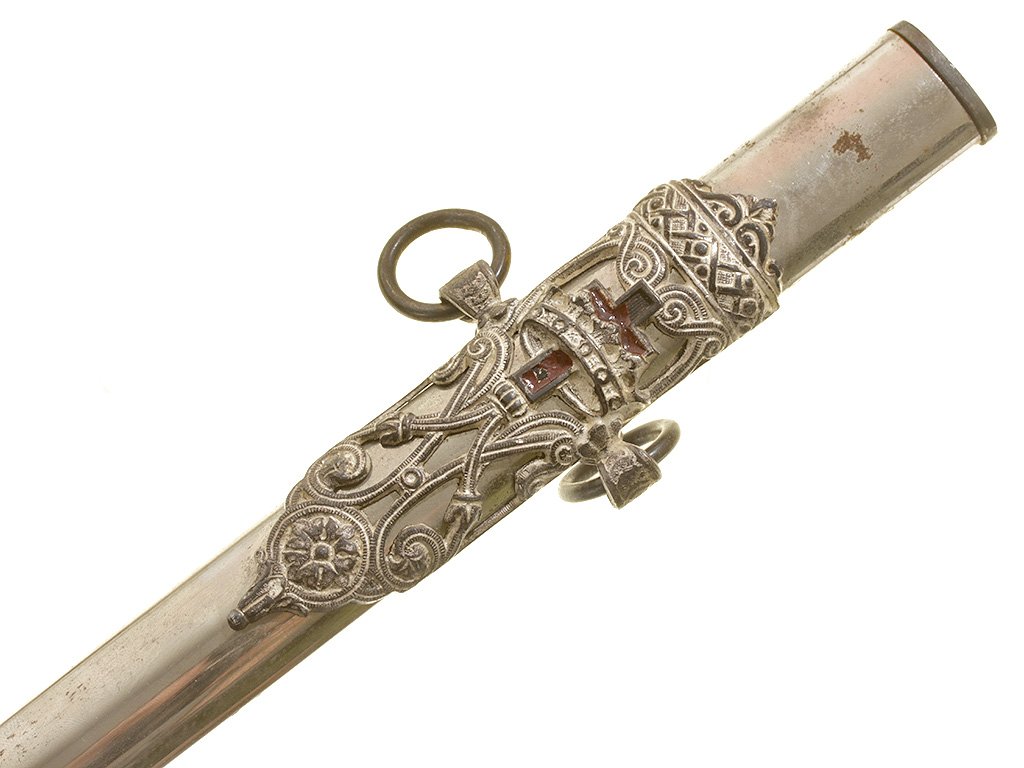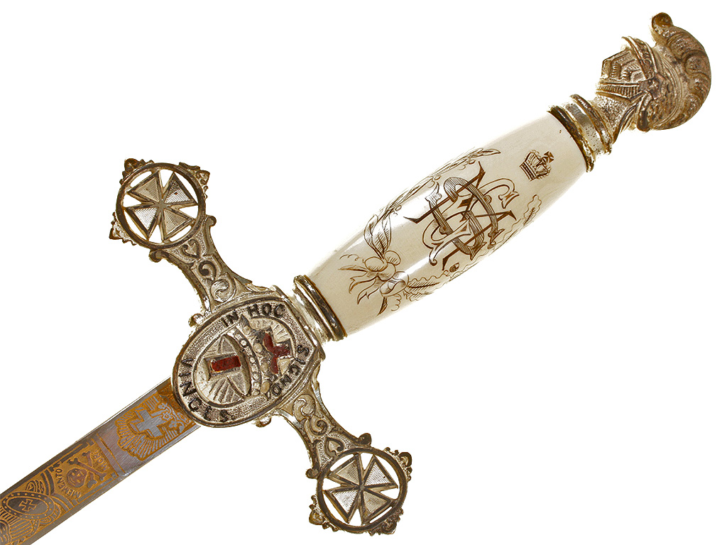 Клинок никелированный, украшен травлением и золочением: на лицевой стороне нанесена фамилия владельца (George M. Sieger), с оборотной - сценка с изображением конных рыцарей в Палестине. Навершие трактовано в виде рыцарского шлема. Очень хорошее состояние.
