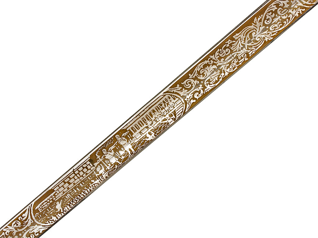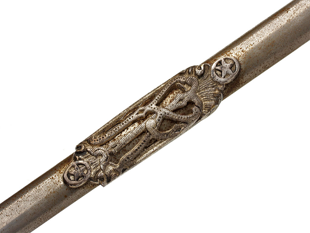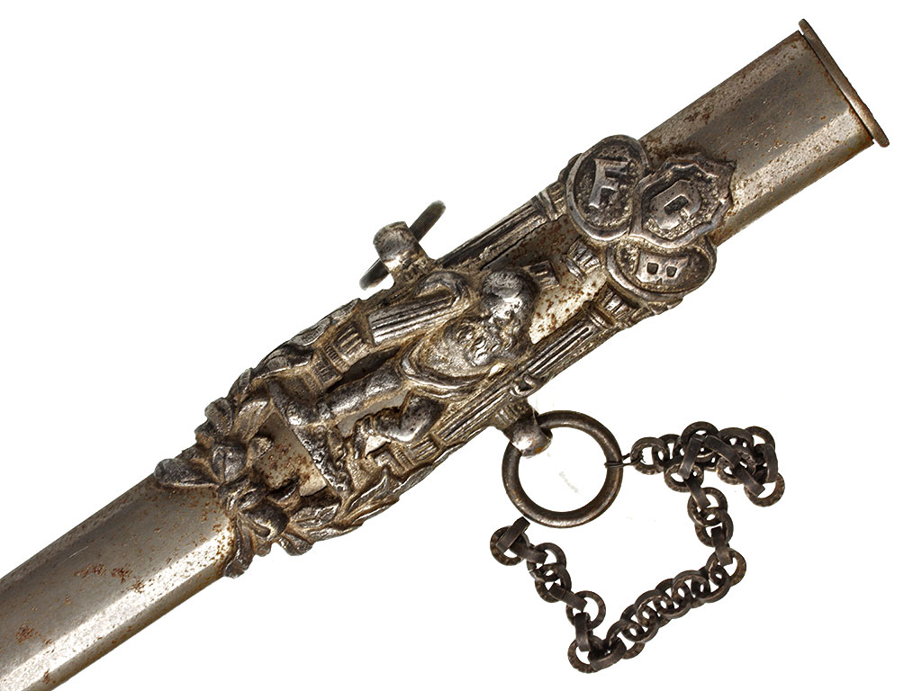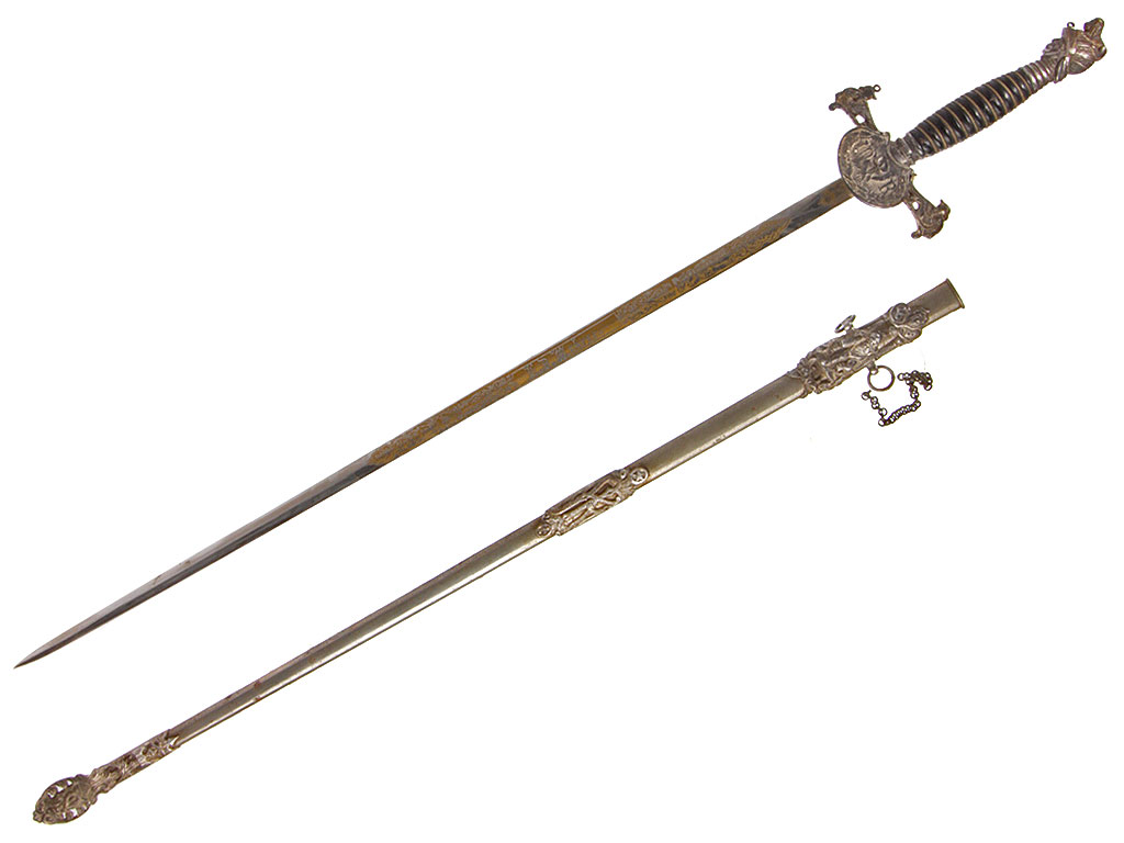 Клинок прямой, ромбического сечения, украшен сюжетным травлением; с лицевой стороны нанесена фамилия владельца. Рукоять обтянута черной кожей, с наклонными желобками, перевитыми латунной проволокой. Навершие трактовано в виде рыцарского шлема, перекрестие имеет с лицевой стороны щиток с эмблемой ложи. Ножны металлические, никелированные. Очень хорошее состояние.