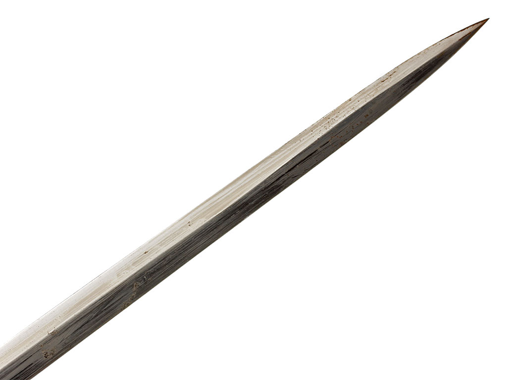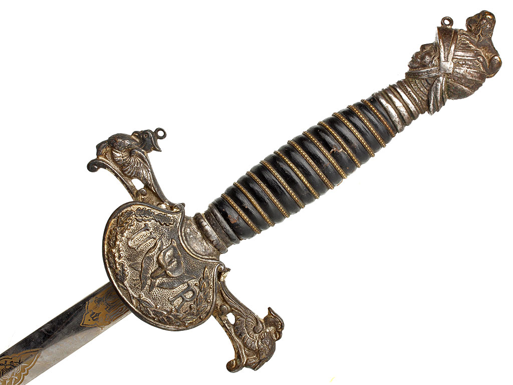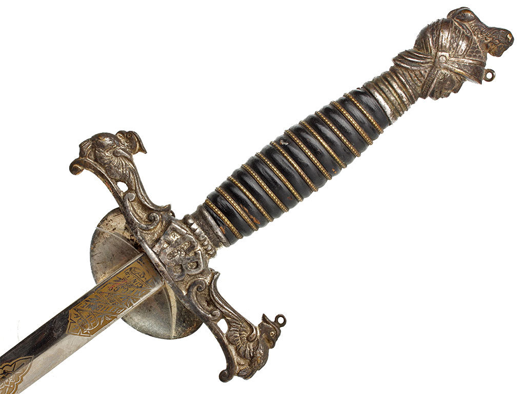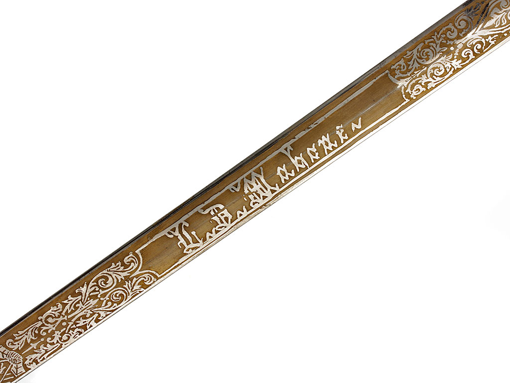 Клинок прямой, ромбического сечения, украшен сюжетным травлением; с лицевой стороны нанесена фамилия владельца. Рукоять обтянута черной кожей, с наклонными желобками, перевитыми латунной проволокой. Навершие трактовано в виде рыцарского шлема, перекрестие имеет с лицевой стороны щиток с эмблемой ложи. Ножны металлические, никелированные. Очень хорошее состояние.