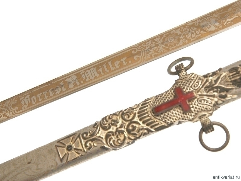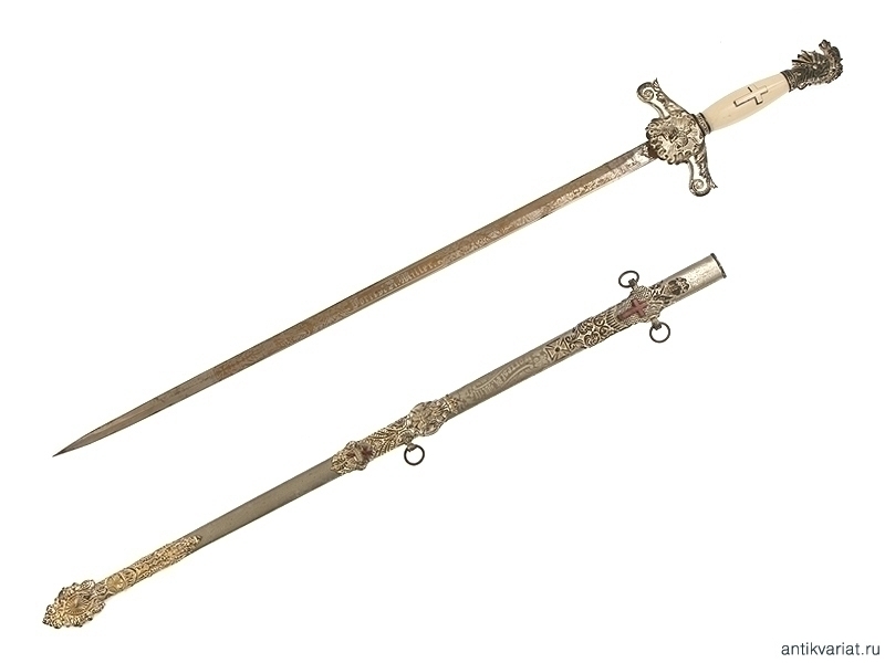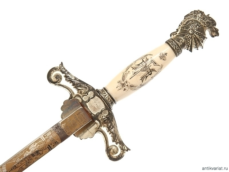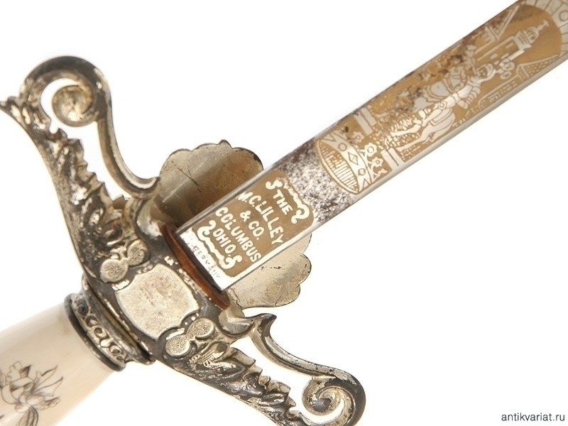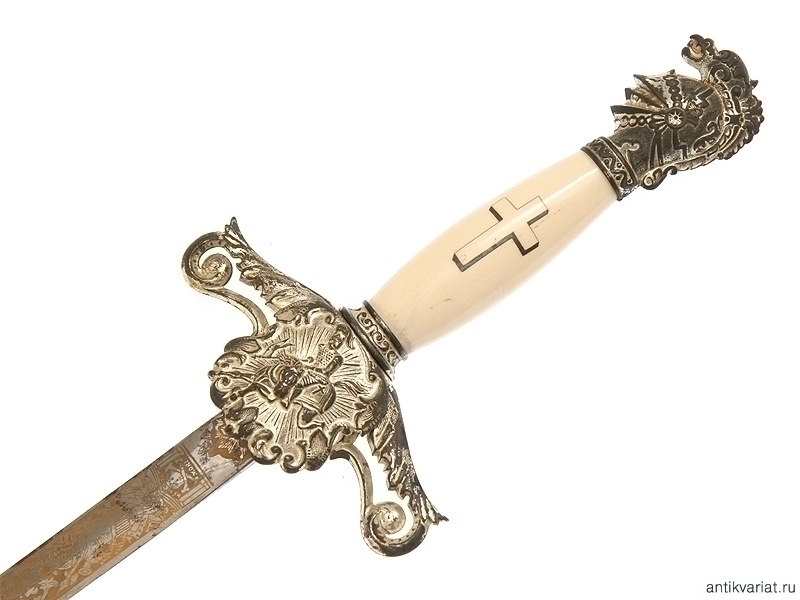 Церемониальный масонский меч, изготовленный в первой половине ХХ века. Клинок никелированный, богато украшен травлением и злочением: изображены всадники из легенды о храме Соломона, рыцари и различная масонская символика. На лицевой стороне клинка нанесены имя и фамилия владельца - "Forrest R.Miller". Клинок маркирован клеймом изготовителя "The M.C.Linney & Co. Columbus Ohio". Там же нанесена миниатюрная надпись "Germany". Навершие рукояти трактовано в виде рыцарского шлема. На гарде имеется рельефное изображение скачущего рыцаря. Металлические элементы рукояти и ножны никелированные, устье ножен украшено эмалью. Хорошее состояние.