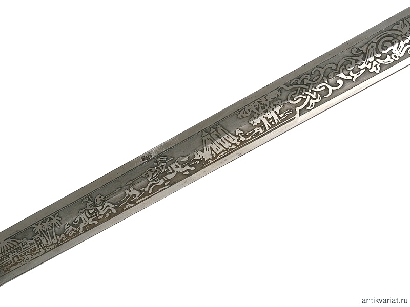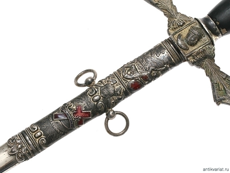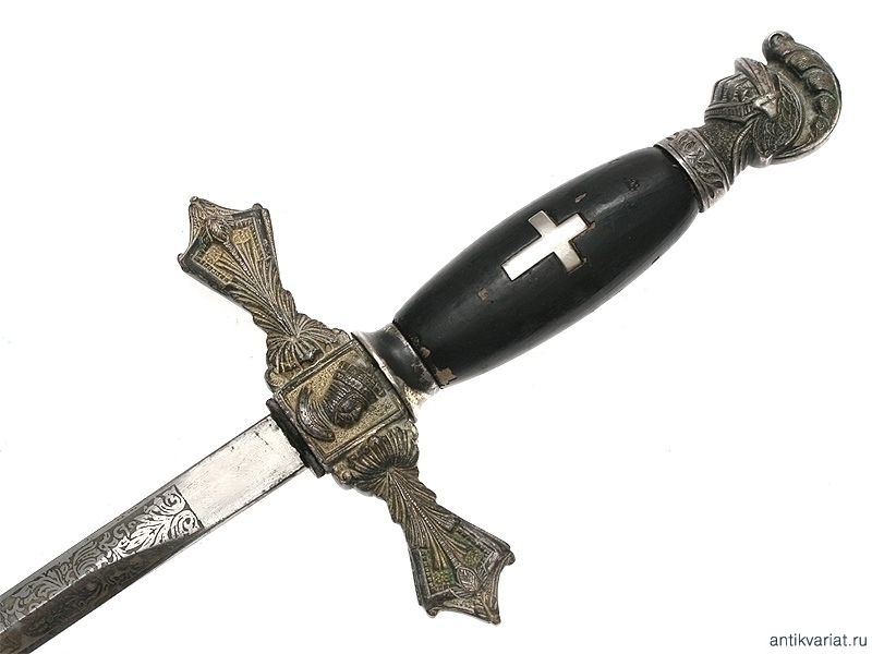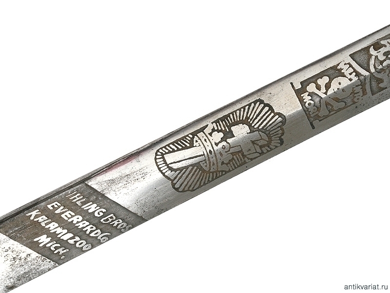 Церемониальный масонский меч, изготовленный в первой половине ХХ века. Клинок никелированный, украшен травлеными вызолоченными орнаментальными картушами, в которых помещены имя и фамилия владельца, а также сокращенное название ложи. Клинок маркирован клеймом изготовителя "Ihling Bros. Everard Co. Kalamazoo Mich.". Навершие рукояти трактовано в виде рыцарского шлема. Металлические элементы рукояти никелированные, как и ножны. Хорошее состояние.