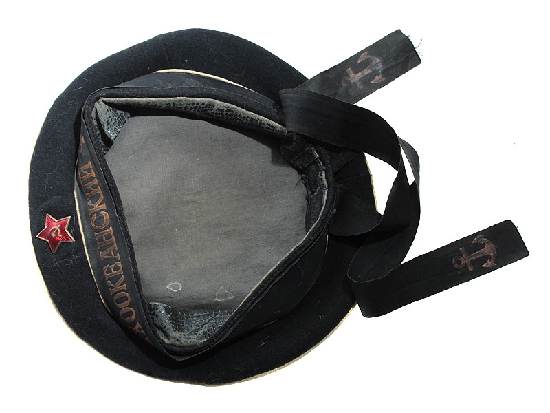 Матросская бескозырка образца 1943 года выпуска второй половины 1940-х - начала 1950-х годов. Из черной ткани с белым кантом, размер 56. Звезда эмалевая. На ленте надпись: Тихоокеанский флот.