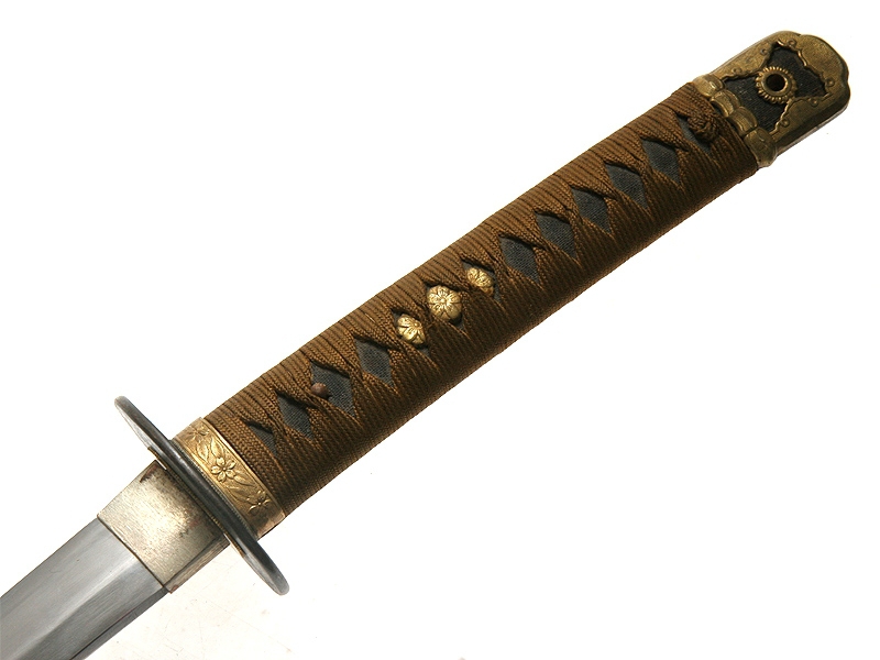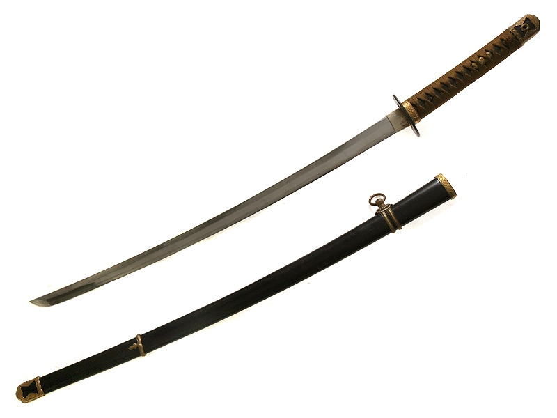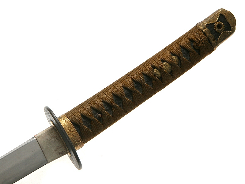 Офицерский морской меч кайгунто середины 1930-х годов. Клинок машинного изготовления, в заводской полировке. Хвостовик имеет одно крепежное отверстие. Рукоять обтянута черным дерматином и оплетена шнуром защитного цвета. Цуба стальная литая овальной формы. Ножны металлические, выкрашенные в черный цвет. Очень хорошее состояние.