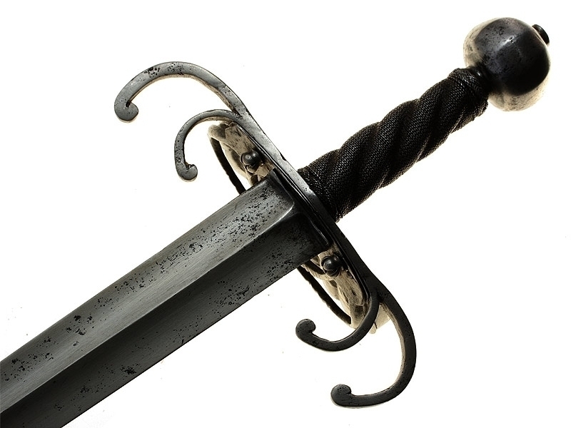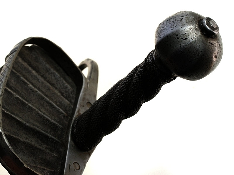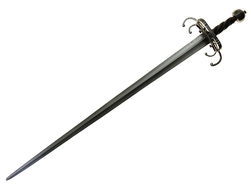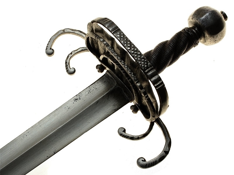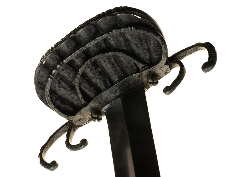 Итальянский меч типа "краб", получивший свое название за характерную гарду. Клинок ромбического сечения, без клейм. Рукоять витая, деревянная, сплошь обмотанная витой стальной проволокой. Навершие шаровидное, слегка приплюснутое, граненое. Крестовина гарды стальная, раздвоенная с обеих сторон. С лицевой стороны - три защитных дужки, расположенных в одной плоскости. Между большой и средней дужками проложена кованая стальная пластина, укрепленная при помощи двух винтов.
