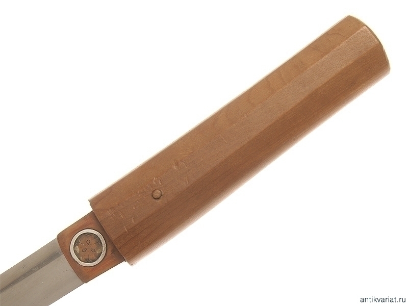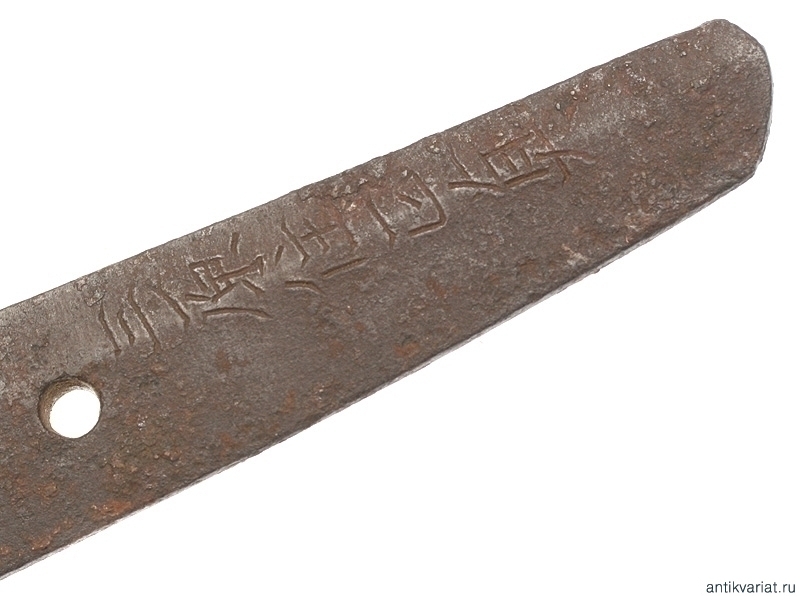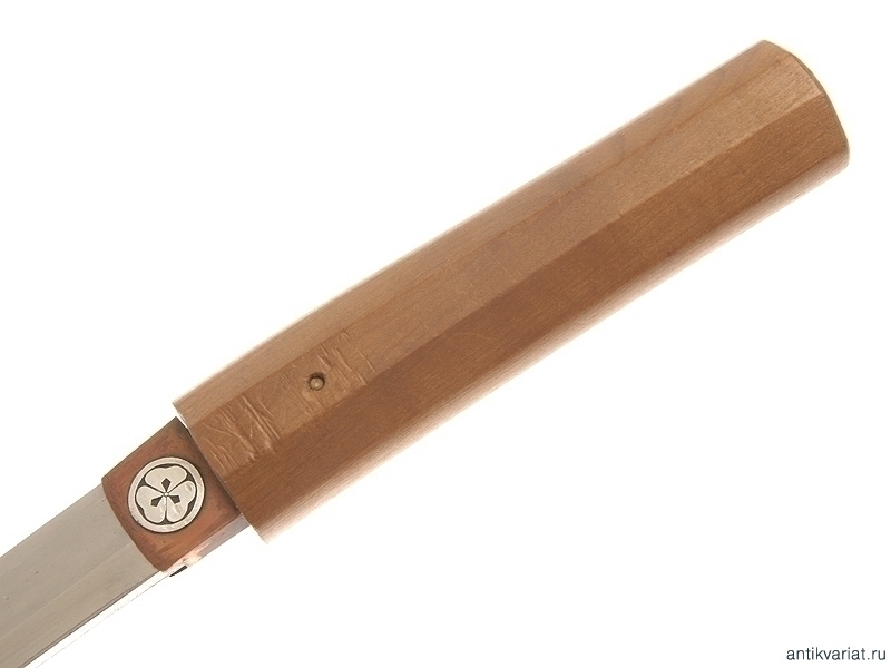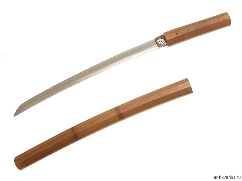 Малый самурайский меч вакидзаси середины XVII века. Клинок с ярко выраженной линией закалки, хвостовик подписан мастером и имеет одно крепежное отверстие. Муфта хабаки инкрустирована серебряными гербами. Клинок помещен в оправу сира-сайя.