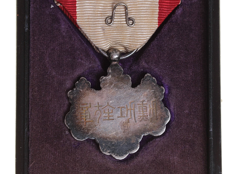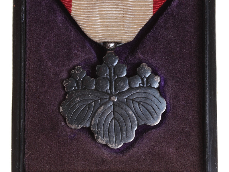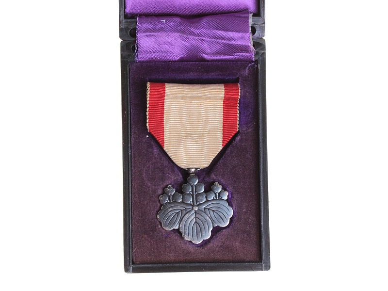 Орден Восходящего Солнца 8-й степени (медаль Белой Павлонии). Полированное серебро, на оригинальной колодке. Отличное состояние, медаль в оригинальном футляре из покрытого черным лаком дерева.