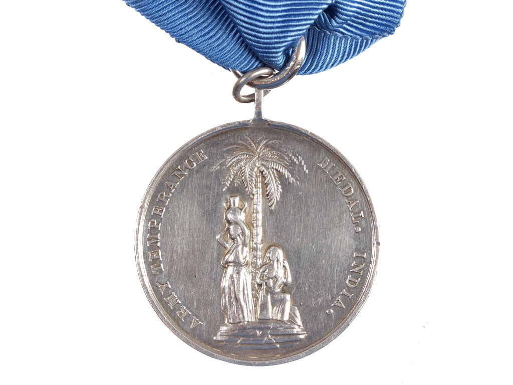 Медаль для рядового состава английских колониальных войск в Индии "За полное воздержание от употребления алкогольных напитков в течение 5 лет службы". Медаль серебряная, на оригинальной шелковой ленте.