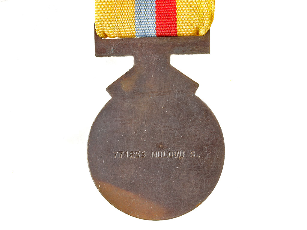 Медаль участника военной операции в Мозамбике. Бронза, с номером и фамилией награжденного на реверсе: "NDLOVU S.". На оригинальной ленте.