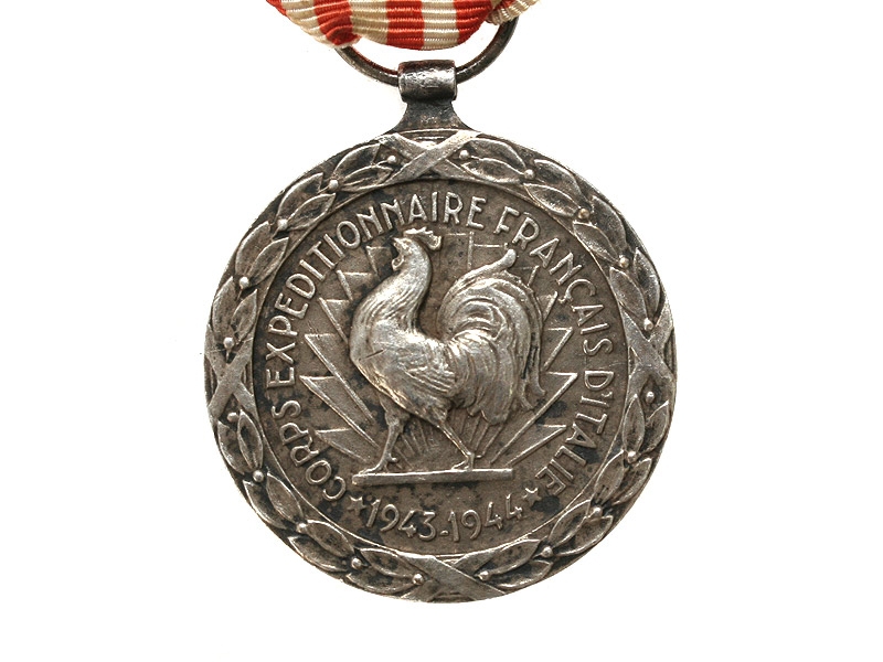 Медаль для военнослужащих французского экспедиционного корпуса в Италии в 1943 - 1944 годах. Белый металл, на оригинальной шелковой ленте.