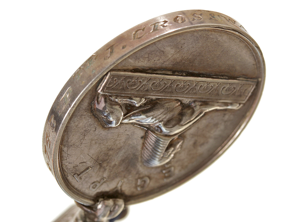 Внизу на гурте выгравированы личный номер, звание, имя и принадлежность награждённого: "4743 Pte J. CROSSWAITE. 2 / SCOTS Gds".