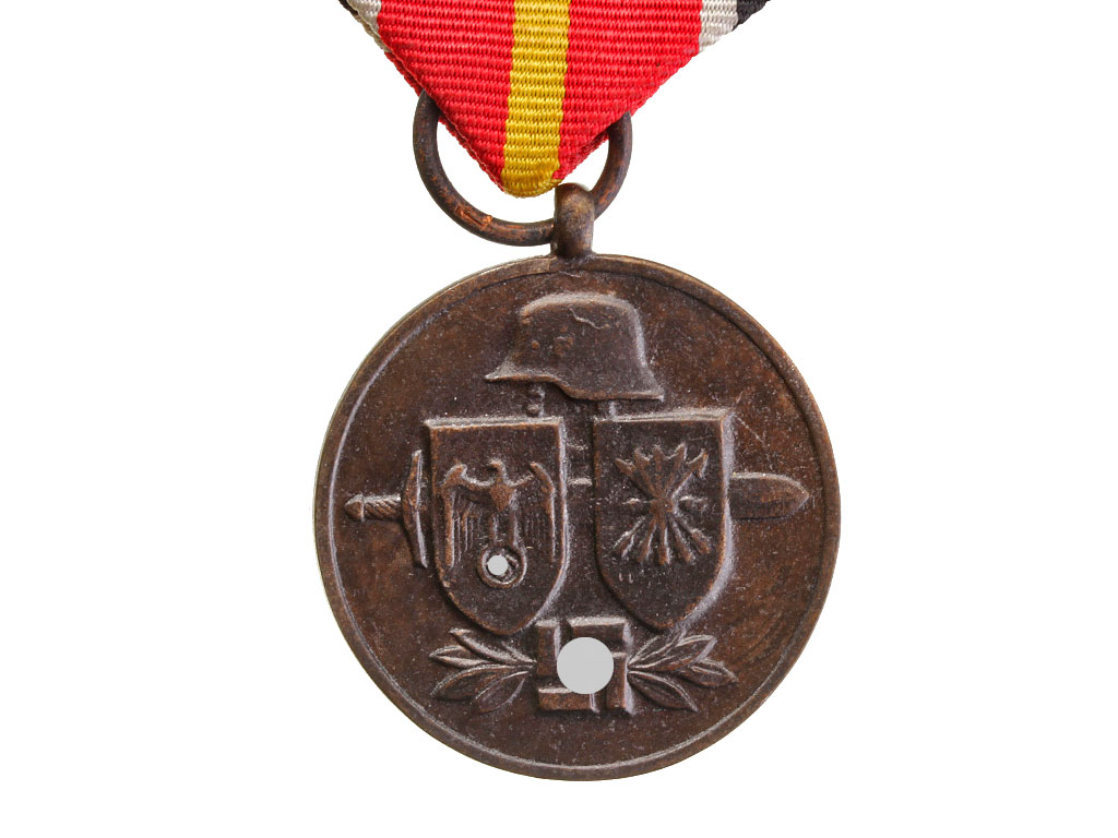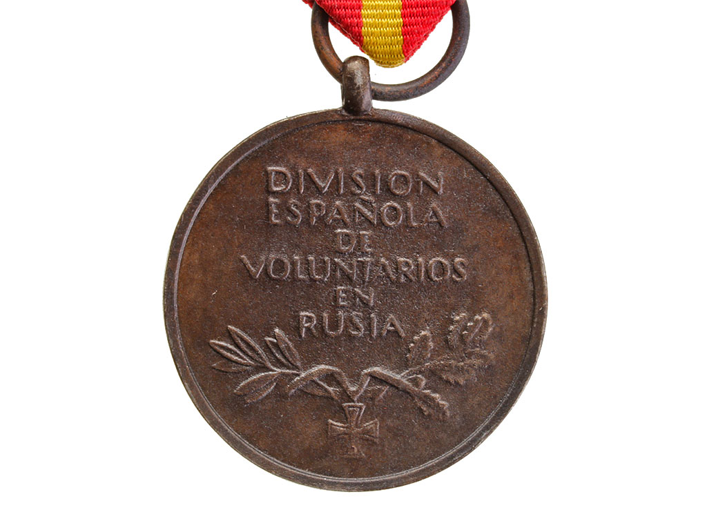 Медаль испанской Добровольческой дивизии, сражавшейся в годы Второй мировой войны на Восточном фронте. Изготовлена из томпака, на оригинальной ленте. Отличное состояние.