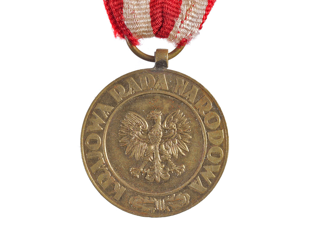 Первый вариант. На лицевой стороне медали в центре - изображение некоронованного орла - Государственного герба ПНР. Изображение орла по окружности окаймлено узким бортиком. В верхней части медали - три буквы: KRN (Krajowa Rada Narodowa), разделенные точками. Медаль окаймлена венком из дубовых листьев, перевитых в нижней части лентой.