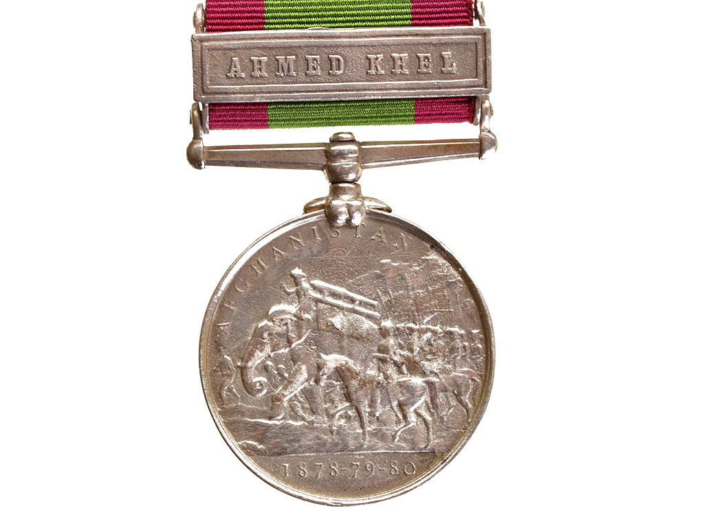 Медаль участника афганской кампании 1878 - 1880 годов. Серебро. Лента с планкой "AHMED KHEL". На аверсе медали - профильное изображение королевы Виктории. На реверсе - изображение английской колонны на марше с надписью "AFGHANISTAN" и датами "1878 - 79 - 80".