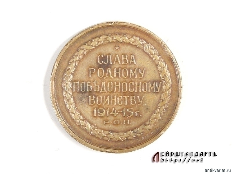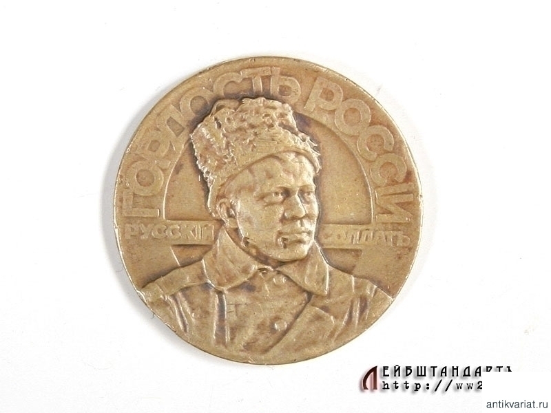 Памятная медаль "Гордость Россiи - русскiй солдатъ", изготовленная из патинированной бронзы во время Первой мировой войны. На оборотной стороне медали имеется надпись: "Слава родному победоносному воинству. 1914 - 1915г.". Предмет в очень хорошей сохранности.