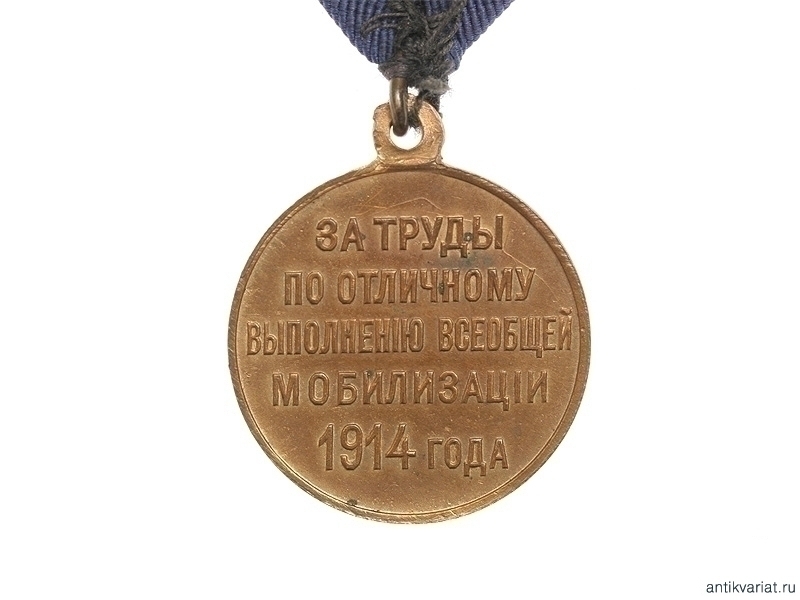 Бронзовая медаль "За труды по отличному выполнению всеобщей мобилизации 1914г.". На оригинальной ленточке.