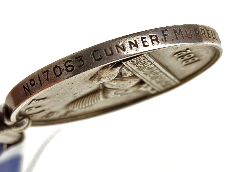 Внизу на гурте выбиты личный номер, звание, имя и принадлежность награждённого: "№17063 GUNNER F.MURRELL D. BATTERY 1st BRIGADE R.F.A.".