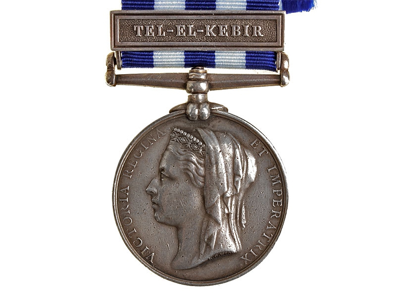Медаль участника англо-египетской войны 1882 года с планкой "TEL-EL-KEBIR". Серебро, лента - современного изготовления. На аверсе медали - профильное изображение королевы Виктории. На реверсе - изображение лежащего сфинкса с надписью "EGYPT" и датой "1882".
