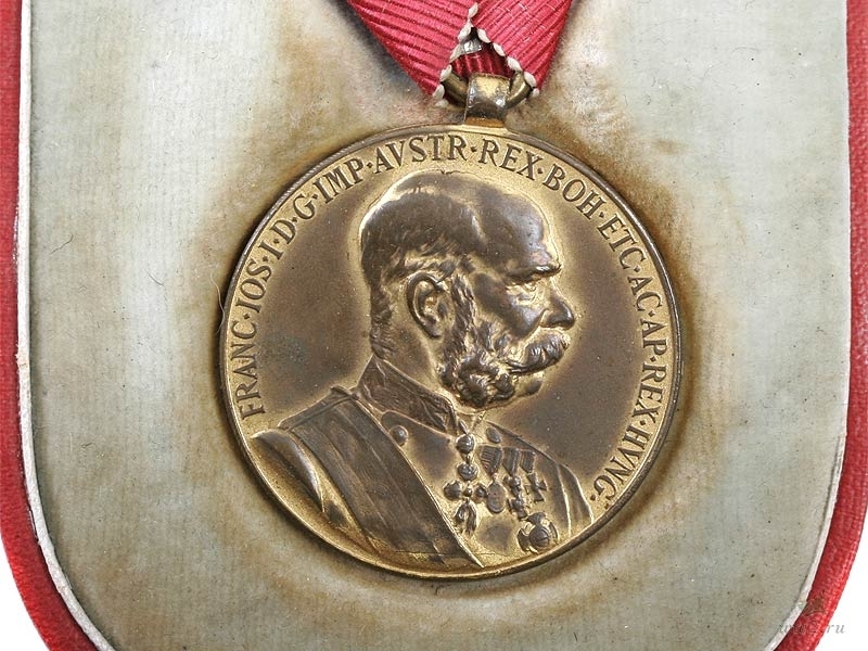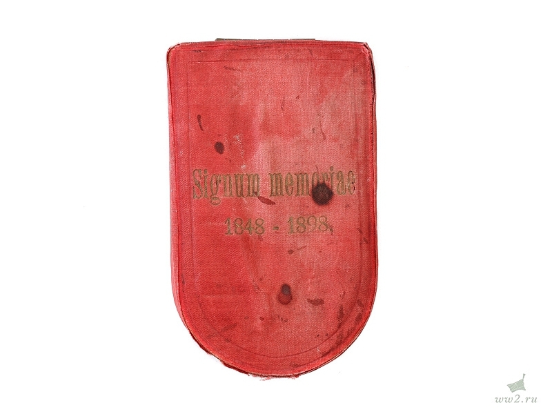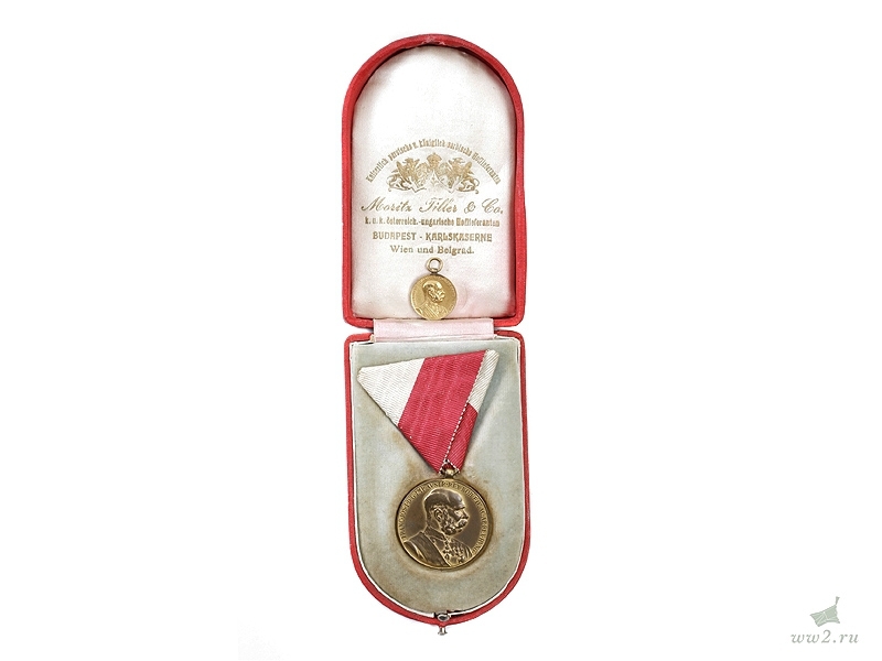 Памятная медаль в память 50-летнего юбилея правления Императора Франца-Иосифа. Помещена в оригинальный футляр, в который также вложен фрачный миниатюрный вариант награды. Отличное состояние.