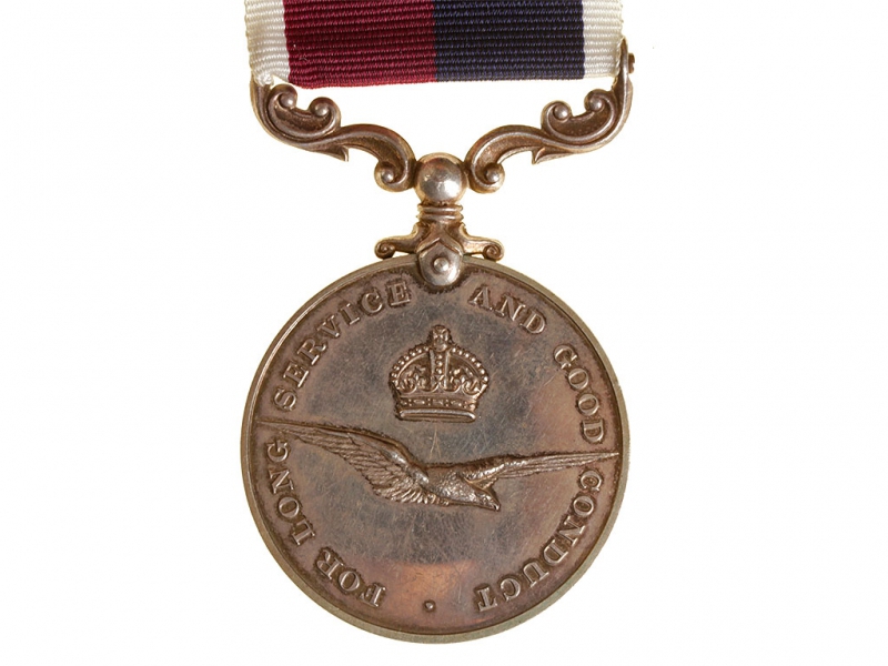 Медаль за заслуги в Королевском военно-воздушном флоте в период правления короля Георга VI. Серебро, на гурте - данные награжденного. На оригинальной ленте.