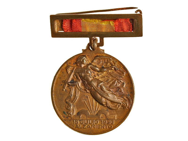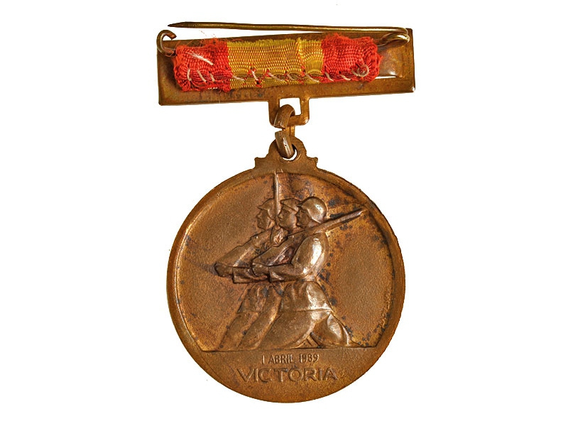 Медаль за победу в гражданской войне 1936 - 1939 годов. Бронза, на оригинальной колодке. На аверсе - аллегорическая фигура Победы с крестом и мечом в руках и надпись: "18 Julio 1936 Alzamiento" (Восстание 18 июля 1936). На реверсе - изображение двух марширующих солдат солдат и фалангиста со знаменем в центре и надпись "1 Abril 1939 VICTORIA" (Победа 1 апреля 1939).