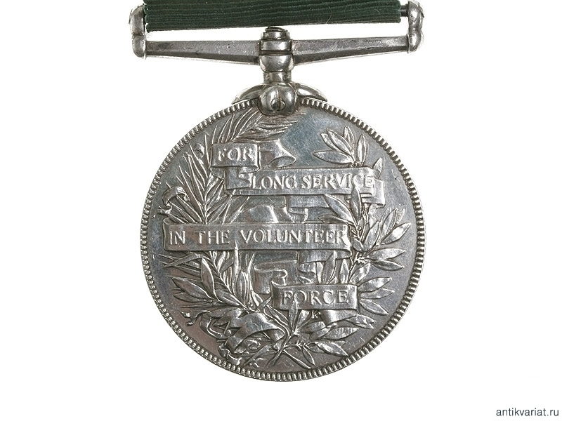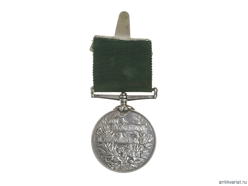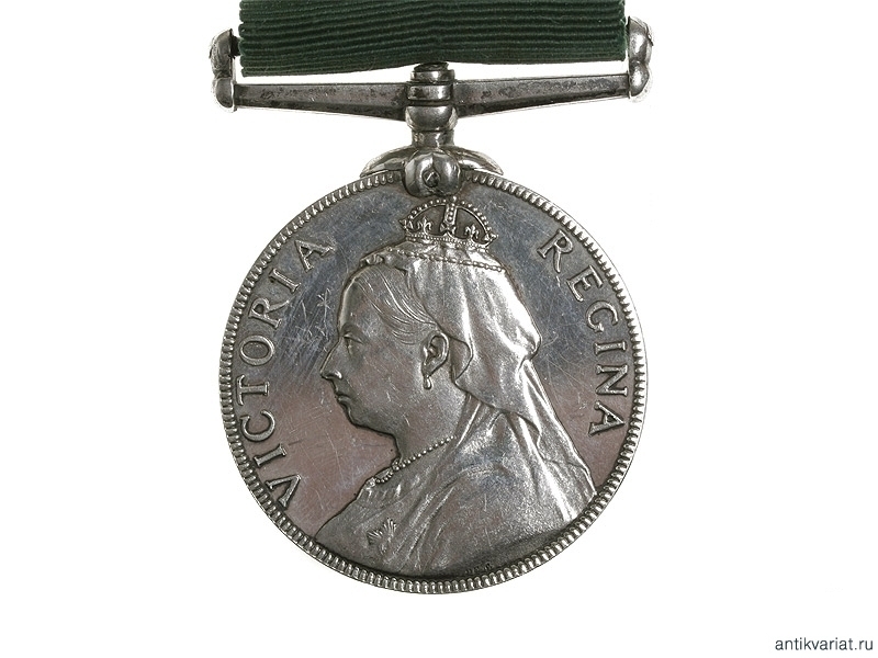 Медаль за службу на шелковой ленте, конец XIX в. На одной стороне изображение Королевы Виктории, а на другой надпись "За долгую службу в волонтерских войсках". Серебро, крепление английской булавкой. Очень хорошее состояние.