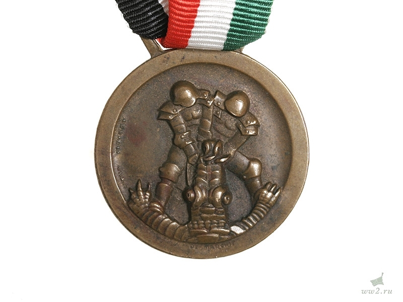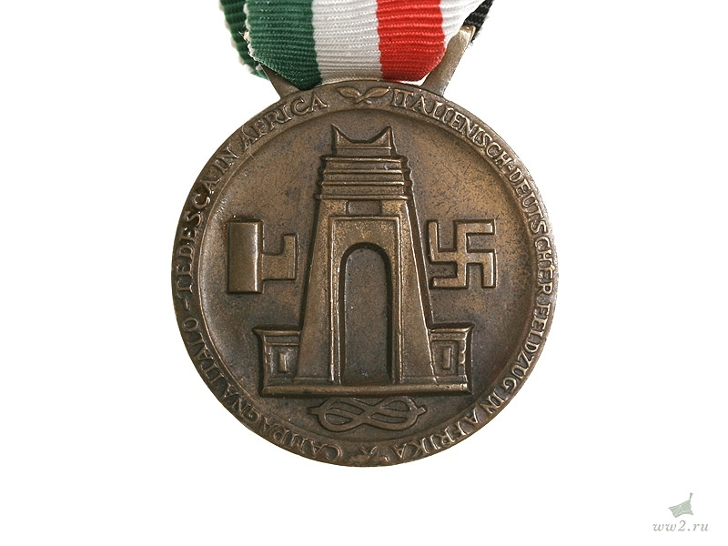 Итальянская медаль за совместную итальянско-германскую кампанию периода Второй мировой войны. Ранний вариант, изготовленный из латуни (позднее для этих целей использовался бронзированный цинковый сплав). Медалью награждались как итальянские, так и (реже) немецкие военнослужащие. Очень хорошее состояние.