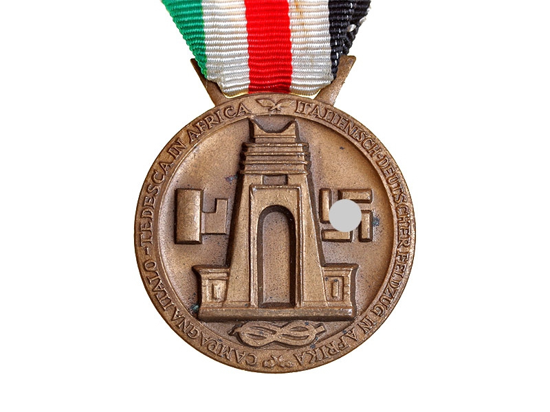 Итальянская медаль за совместную военную кампанию в Африке в годы Второй мировой войны. Бронза, на оригинальной шелковой ленточке. Медалью награждались как итальянские, так и германские военнослужащие. Очень хорошее состояние.