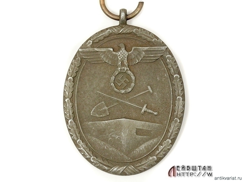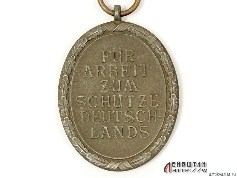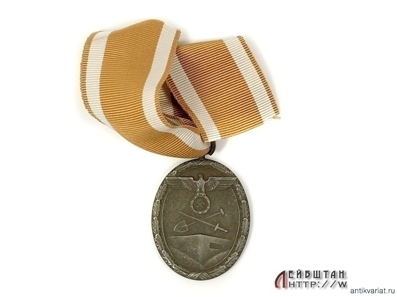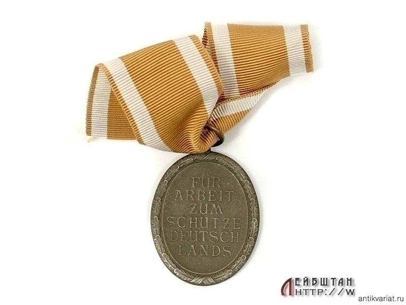 Медаль за строительство оборонных сооружений ("Защитного Вала") в хорошем состоянии. Изготовлена из бронзированного цинка, имеются частичные утраты бронзового покрытия, на длинной шелковой ленточке.