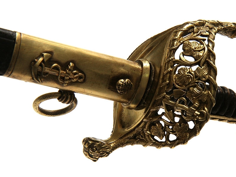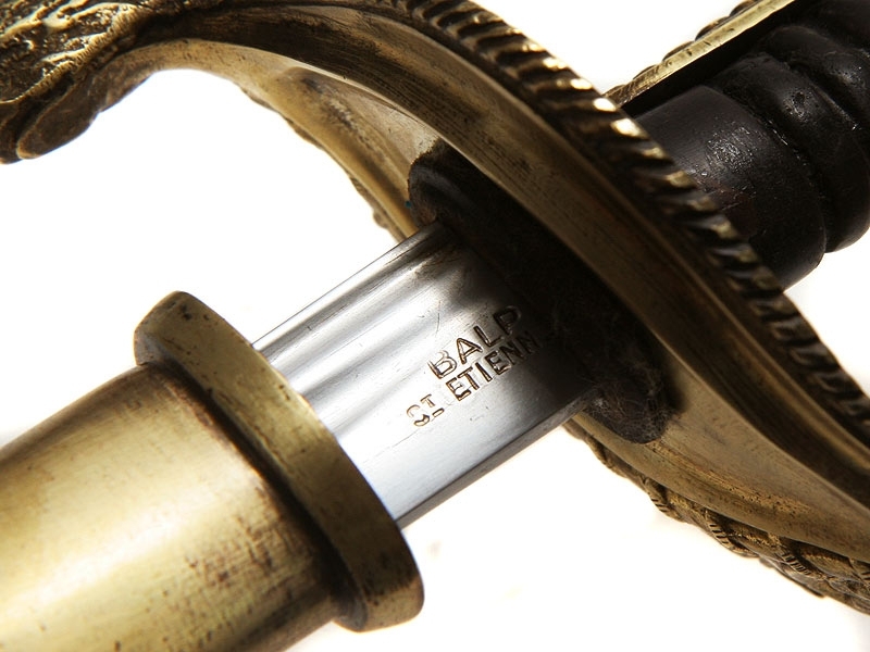 Французская морская офицерская сабля образца 1837 года. Клинок с клеймом арсенала в Сен-Этьене у основания клинка, рукоять из черного рога. Прибор бронзовый, золочение почти не сохранилось. Ножны кожаные с бронзовым прибором.