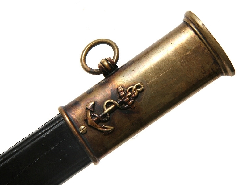 Французская морская офицерская сабля образца 1837 года. Клинок с гравированной надписью арсенала в Клингентале на обухе, рукоять из черного эбонита. Прибор бронзовый, золочение не сохранилось. Ножны кожаные с бронзовым прибором.