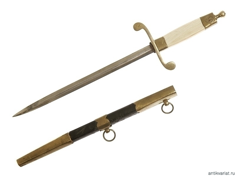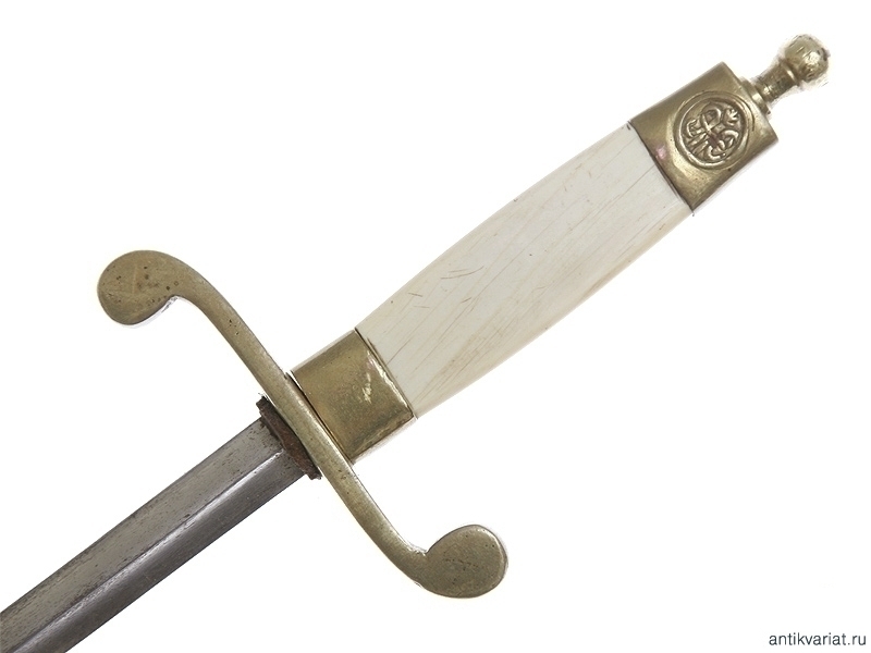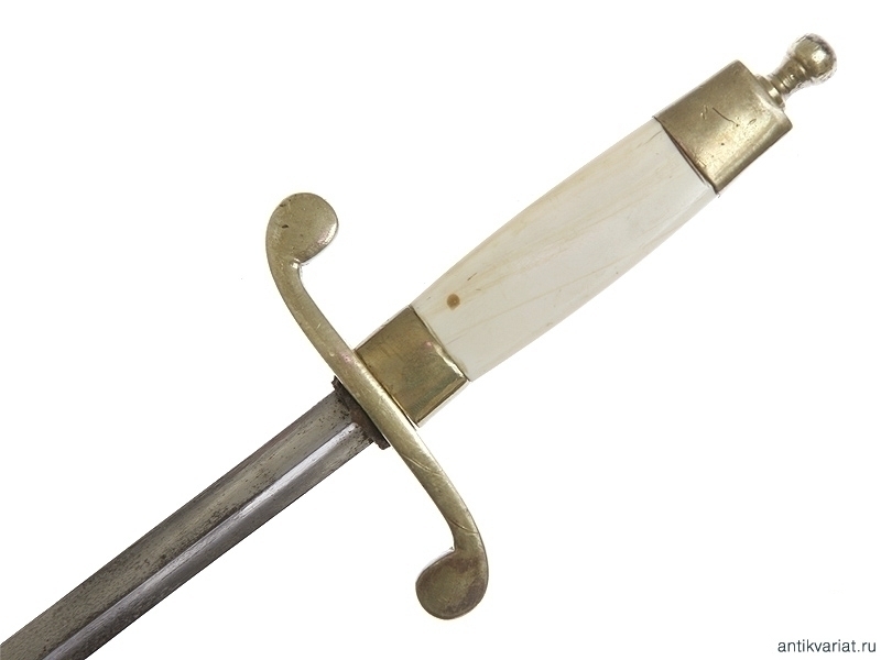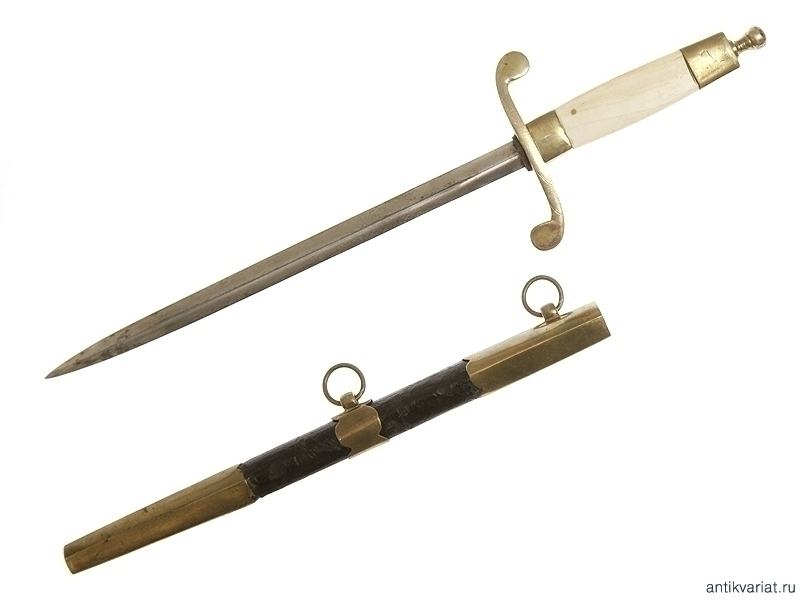 Кортик морской офицерский с игольчатым клинком. Рукоять из слоновой кости, прибор из бронзы, частично сохранилось золочение. Без клейм. 1910-е годы. Очень хорошее состояние.