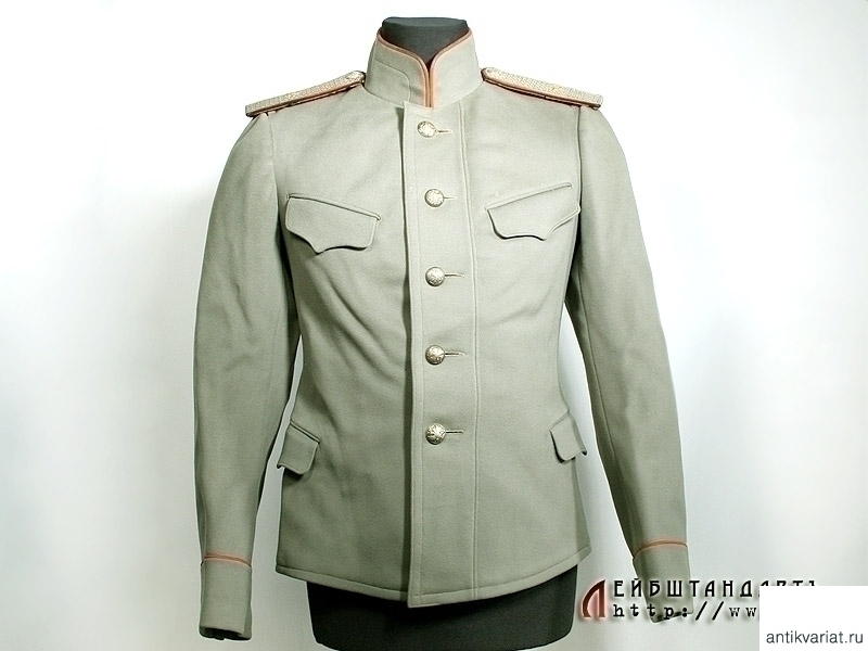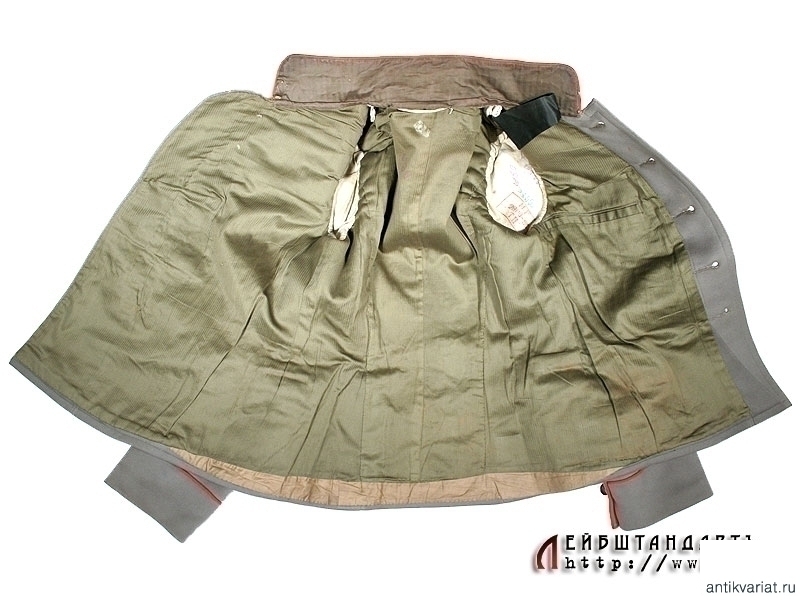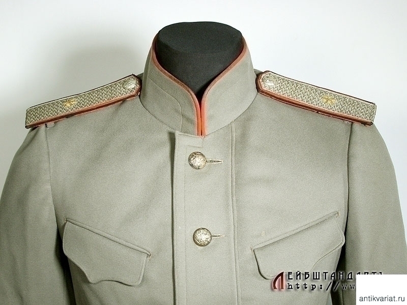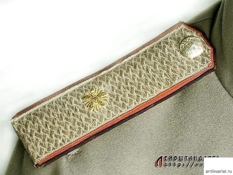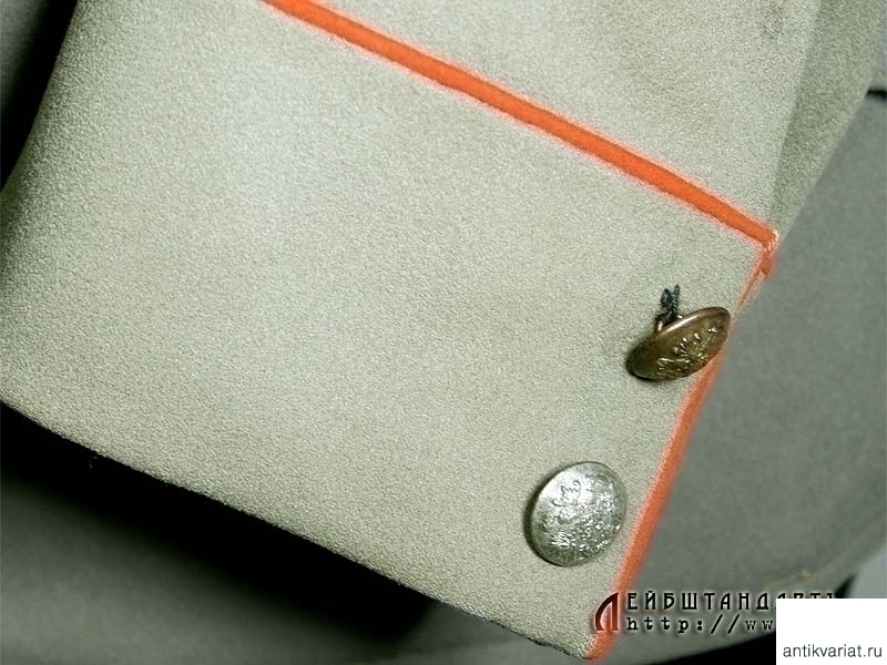 Погоны из серебристого галуна с шитыми позолоченными звездами, с красным и черным кантом. Редкий мундир в очень хорошей сохранности.