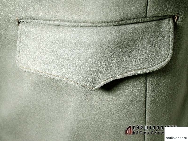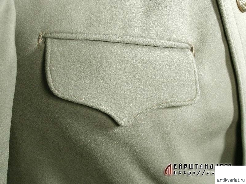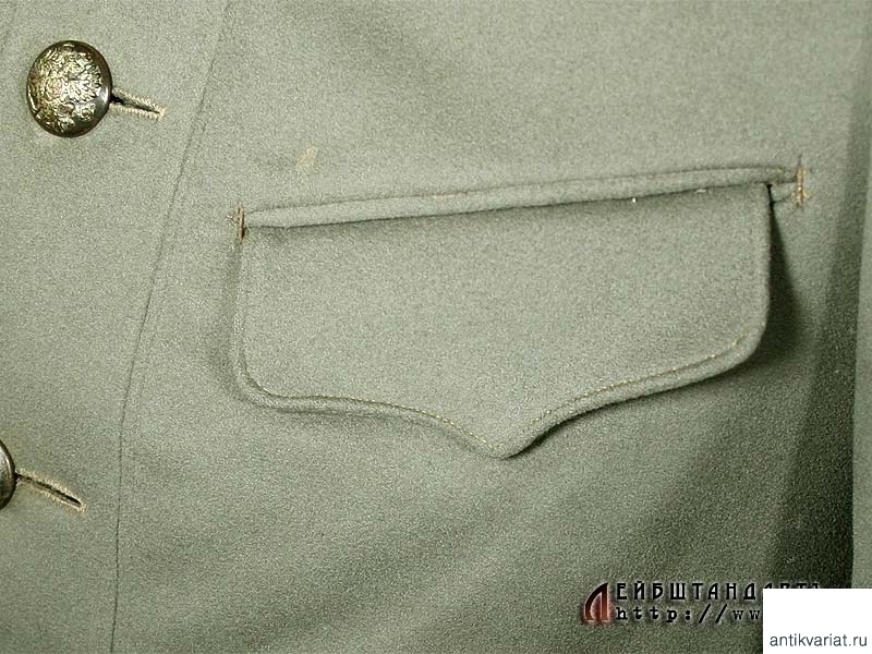 Мундир генерала - медика в очень хорошем состоянии. Сшит из высококачественного кастора, чем выгодно отличает его по качеству исполнения от прочих мундиров. Материал серо-зеленого цвета, с красной выпушкой по воротнику и обшлагам. Мундир однобортный, с одним рядом посеребренных пуговиц. Снабжен нагрудными и боковыми карманами с клапанами, которые застегиваются на кнопки.