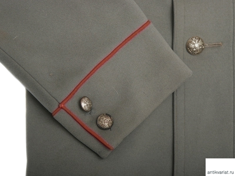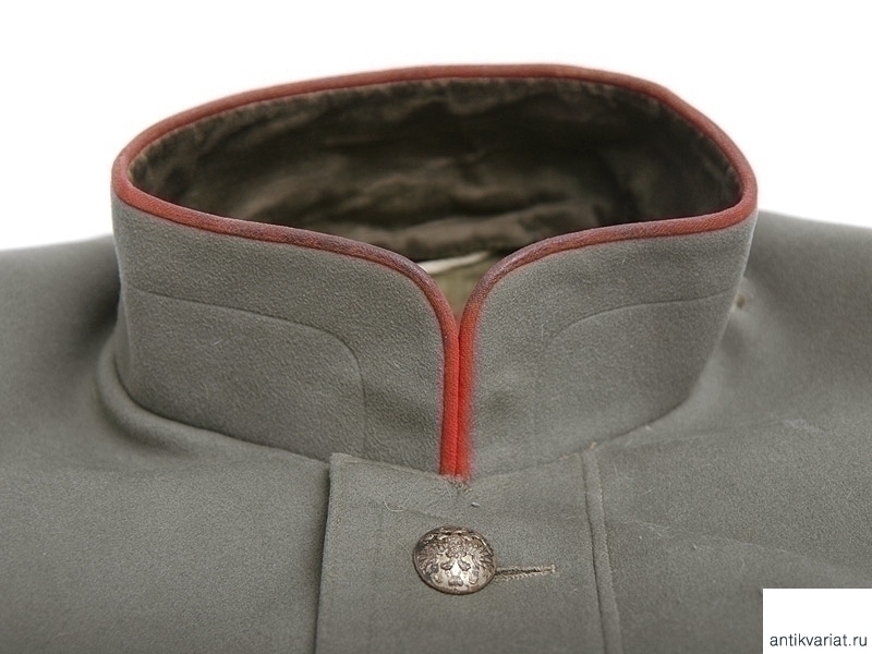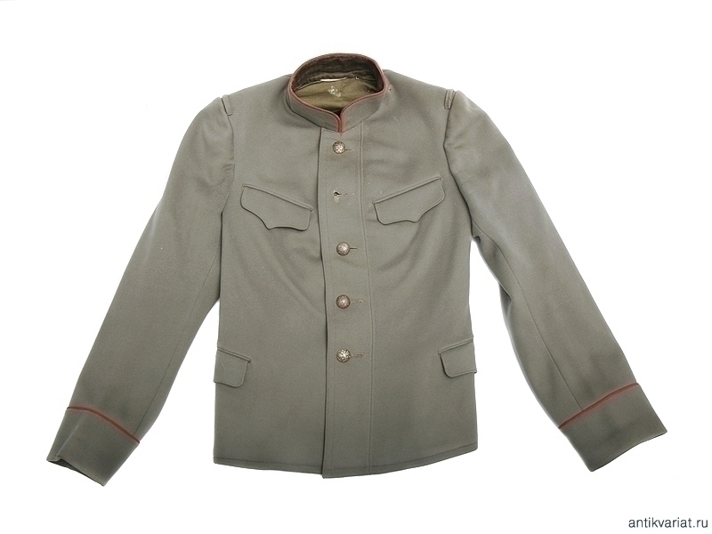 Офицерский полевой походный мундир образца 1907 года. Из сукна оливково-зеленого цвета с красным кантом по стоячему воротнику и обшлагам. Пуговицы гербовые посеребренные. Размер примерно 46 - 48. Очень хорошее состояние.