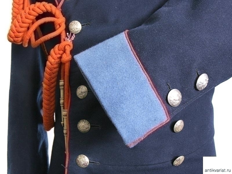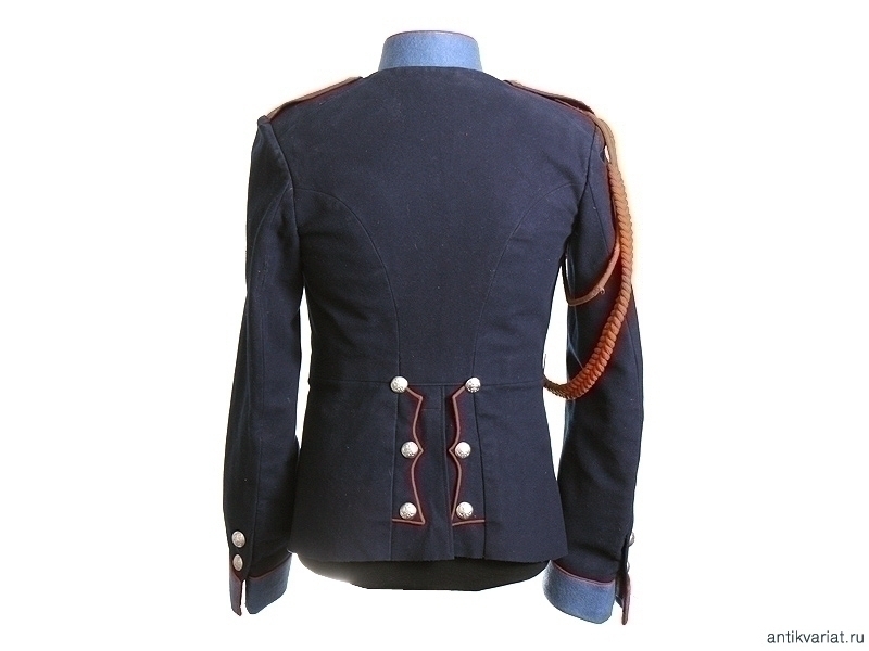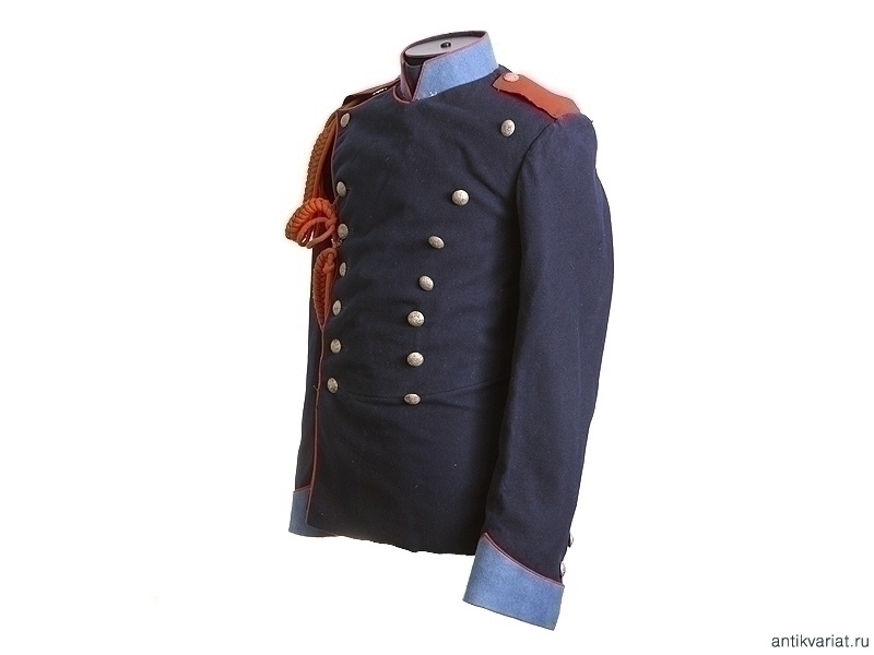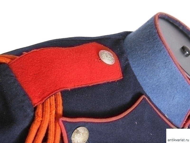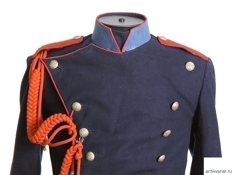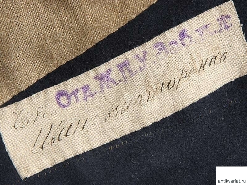Мундир рядового Отдельного Жандармского полицейского управления Забайкальской железной дороги с соответствующими оригинальными клеймами на подкладке. Двубортный мундир из темно-синего сукна с белым прибором, с оригинальным аксельбантом конной полиции. Обшлага и стоячий воротник мундира голубые, с красным кантом. Погоны красного сукна. На подкладке имеется бирка с чернильным штампом и написанной от руки фамилией владельца - "Иван Викторенко". Размер примерно 46. Очень хорошее состояние.