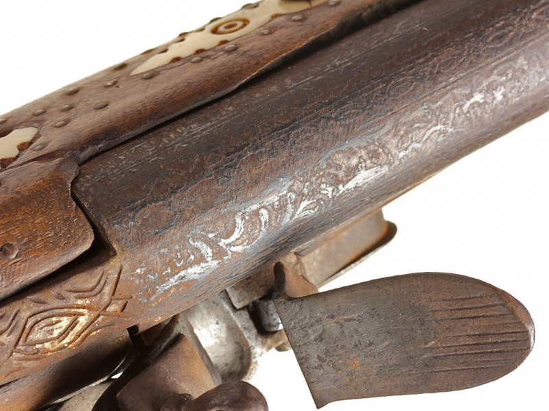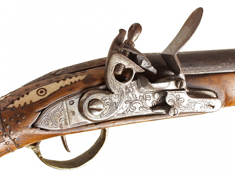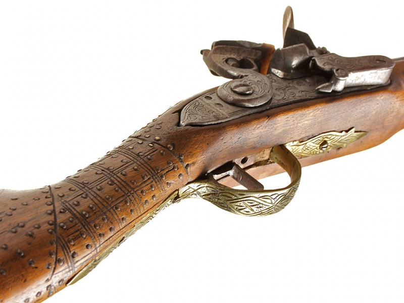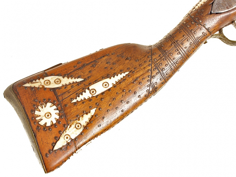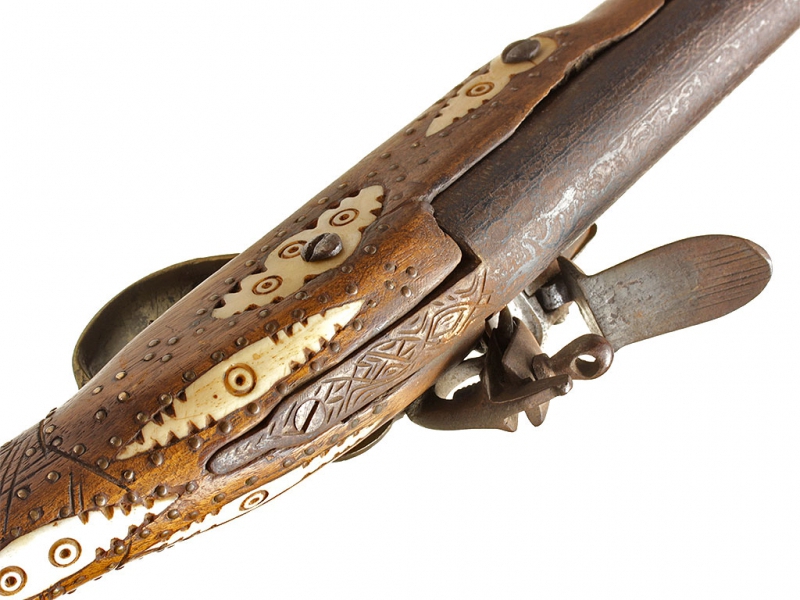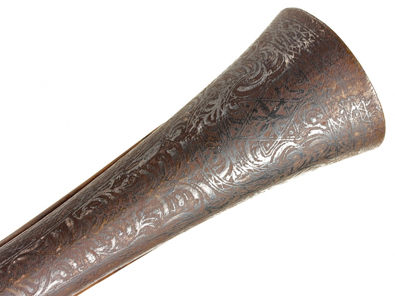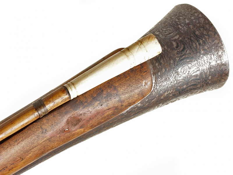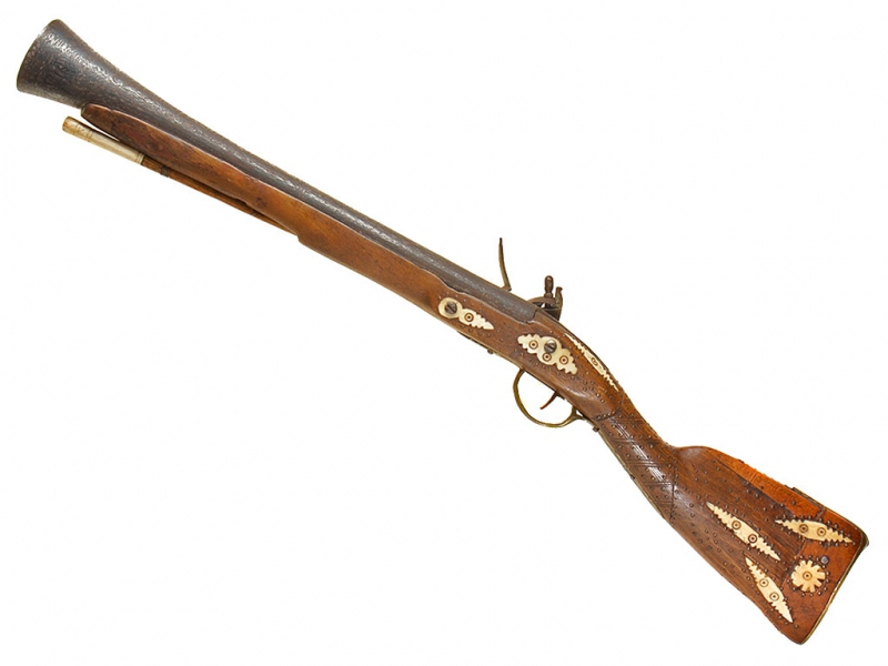 Тромблон, изготовленный в начале XIX века. Стальной ствол европейского производства (возможно, английский) с широким раструбом, характерным для этого вида оружия. Украшен тонким черневым растительным орнаментом, нанесенным по всей длине ствола. Кремневый замок украшен грубым гравированным орнаментом, без клейм. Оригинальная деревянная ложа с прикладом хорошо сохранилась, затыльник приклада изготовлен из латуни. Сохранился оригинальный шомпол. Приклад имеет украшения в виде инкрустации пластинками из слоновой кости.