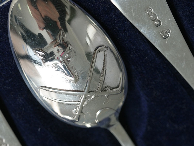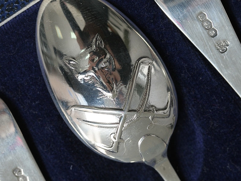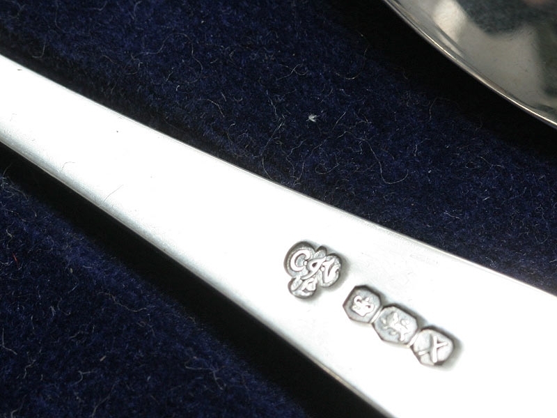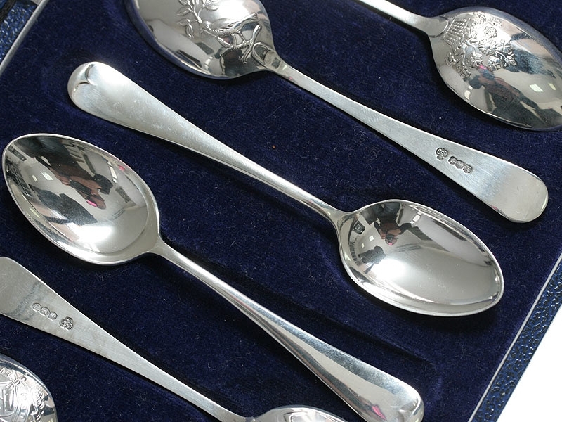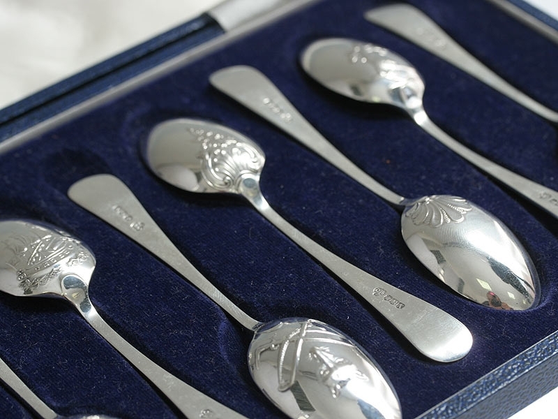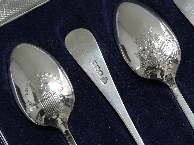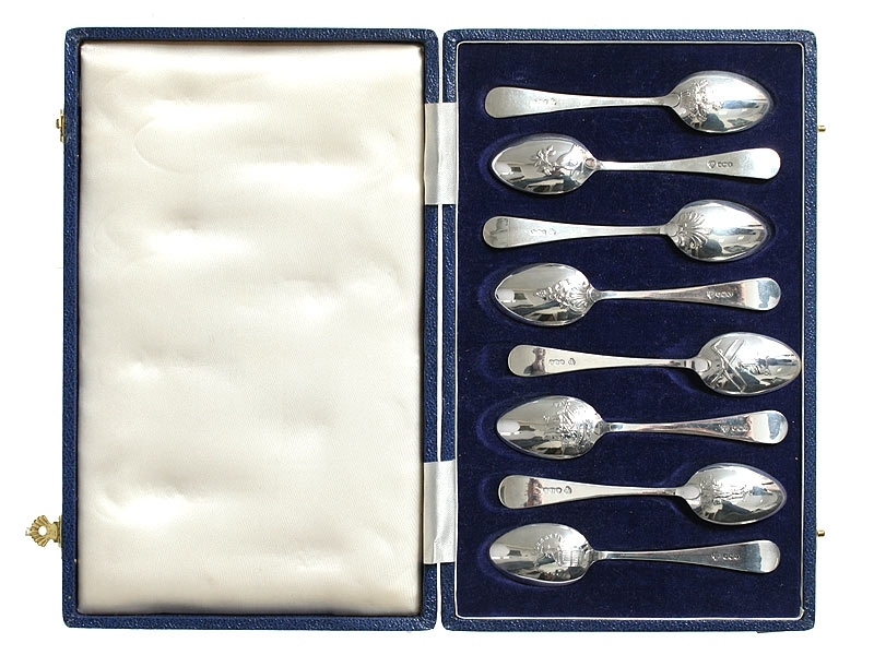 Набор из 8 чайных ложечек. Изготовлены из серебра, на каждом предмете имеются многочисленные английские пробирные клейма, на оборотной стороне каждой ложечки - различные рельефные изображения. Набор в оригинальном футляре, обтянутом снаружи темно-синим коленкором.