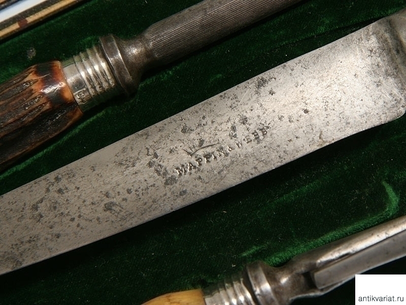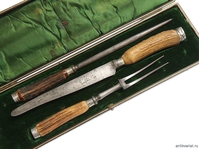 Набор, состоящий из ножа, двузубой вилки со стопором и точильного бруска в футляре. Рукояти из оленьего рога, втулки серебряные.