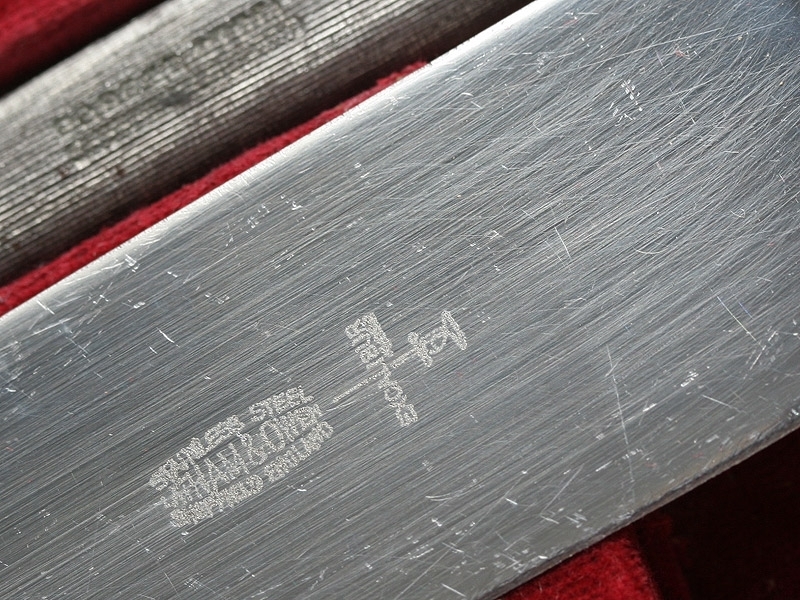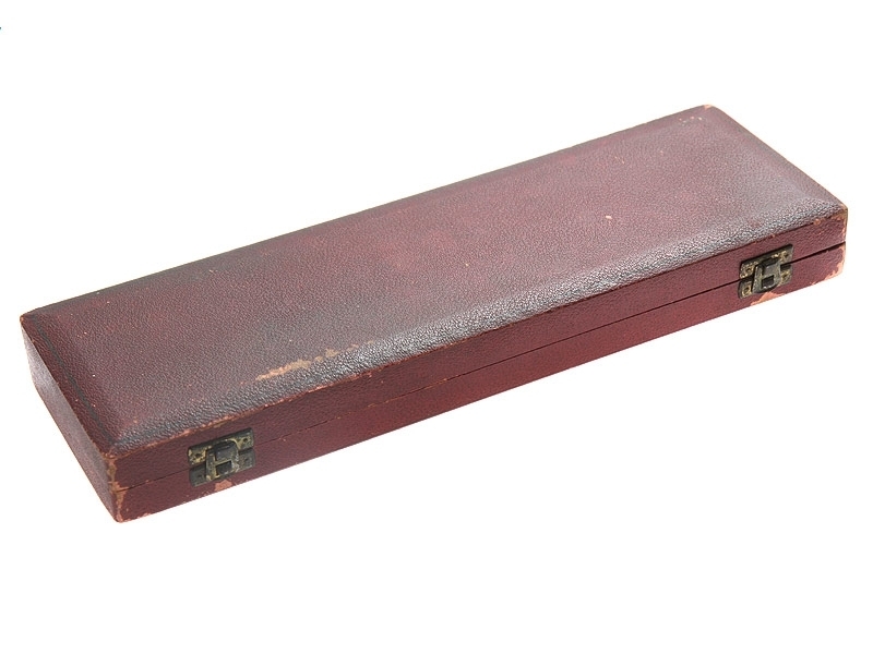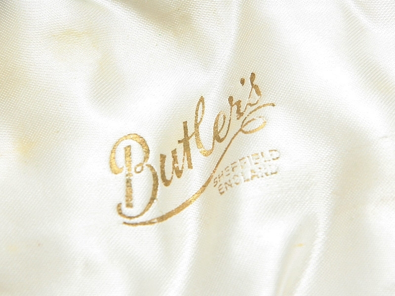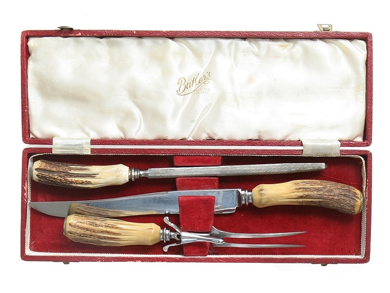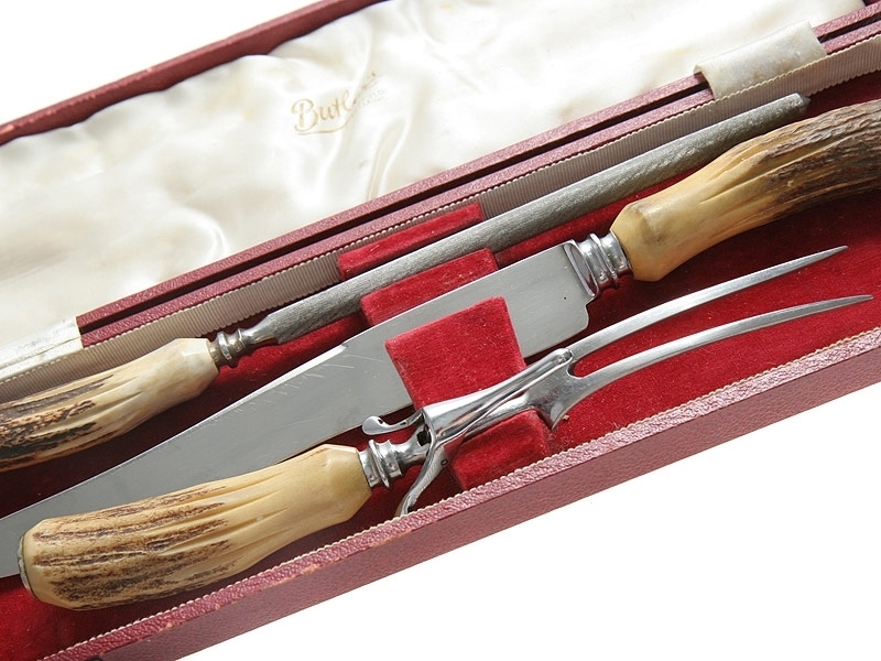 Набор, состоящий из ножа, двузубой вилки со стопором и точильного бруска в футляре. Рукояти из оленьего рога, на внутренней стороне крышки - клеймо изготовителя "Butlers".
