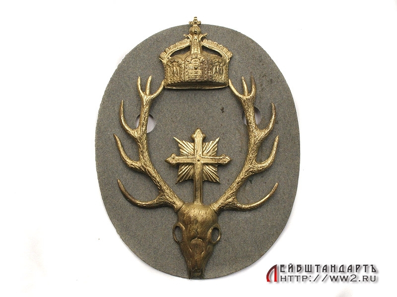 Наградная егерская нашивка (Kaiserabzeichen) в очень хорошем состоянии. Представляет собой позолоченное изображение оленьего черепа с сияющим крестом между рогов под кайзеровской короной. Сохранилась подложка из плотного серого картона.