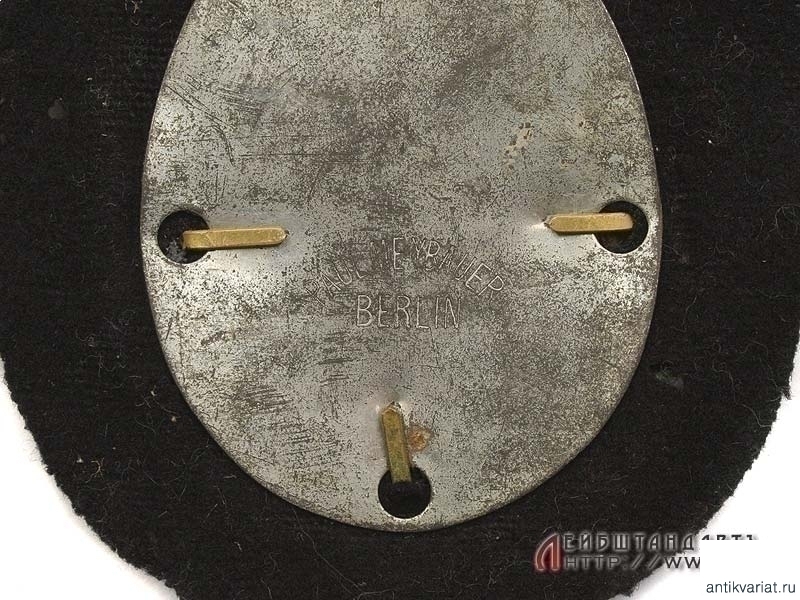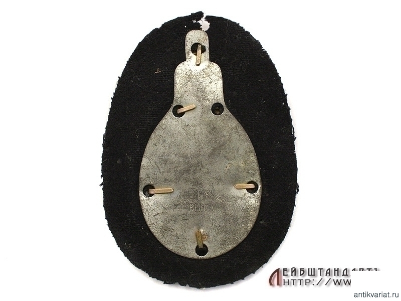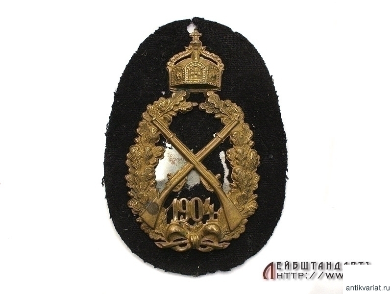 Наградная нашивка (Kaiserabzeichen) в очень хорошем состоянии. Представляет собой позолоченный латунный венок из дубовых листьев с наложенными на него перекрещенными винтовками под кайзеровской короной. Внизу указан год награждения: 1904. Сохранилась темно-синяя суконная подложка и цинковая пластина с клеймом фирмы "Paul Meybauer" в Берлине.