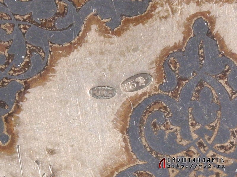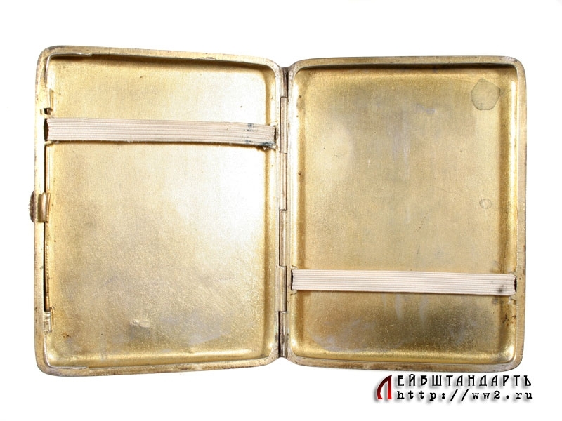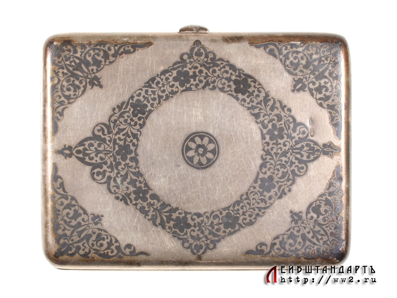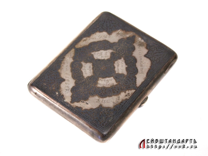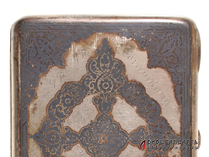 Наградной портсигар от Реввоенсовета Уральского военного округа, выданный т. Рогаткину - командиру учебного батальона 8 стрелкового полка за хорошую стрелковую подготовку батальона 7 ноября 1932 года. Портсигар изготовлен из серебра 875 пробы и украшен черневым орнаментом, а внутри покрыт прекрасно сохранившейся позолотой. Редкий предмет - в то время, при неотработанной наградной системе, в качестве наград вручались именно подобные вещи. Отличное состояние.