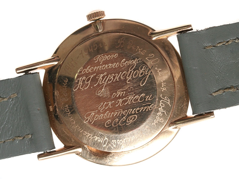 Золотые часы "Полет" с гравированной надписью "В день 20-летия Победы в Великой Отечественной войне Герою Советского Союза К.Г.Кузнецову от ЦК КПСС и Правительства СССР".